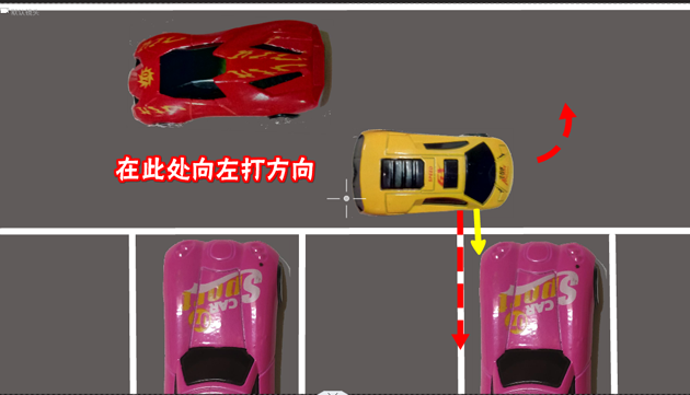 看上图,当学员的车行驶到此处,也就是驾驶员肩膀对上库边线(图中红色虚线箭头指向的位置),或者右视镜对上旁边的车灯(图中黄色箭头指向的位置)时,这个地方就是打轮的时机。