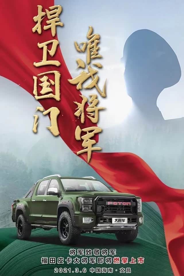 日前,我们从福田汽车官方获悉,福田大将军皮卡将于3月6日正式上市。据悉,新车已于2020北京车展期间正式亮相并同步开启预售,其预售价为12.98万-18.38万元。此外,新车将推出休闲版、运动版、越野版三种外观风格车型,以及2.0T汽油、2.0T柴油、2.5T柴油三种动力组合可选。