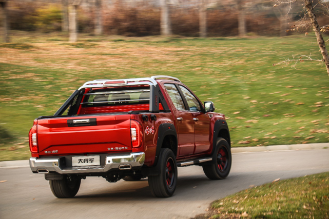 车身侧面,新车采用标准的皮卡车身造型,视觉上十分魁梧。新车采用大量硬派越野元素设计,包括前后翼子板上大幅向外突出的黑色铆钉宽体、车顶行李架、后车厢全尺寸龙门架、红黑双色多辐条轮圈,都使得整车外观更具硬汉气质。