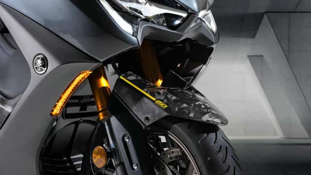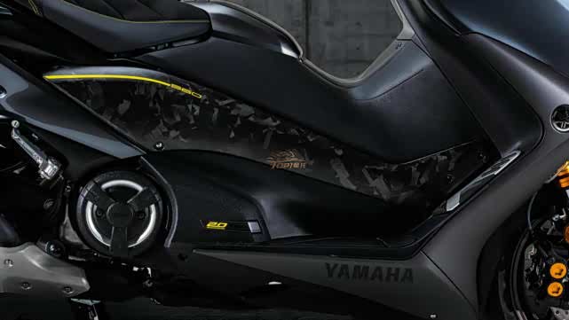 独特的复合碳纤维前挡泥板,侧面板和排气隔热板,均由这种材料制成,黄色的细节点缀使人联想到TMAX最原始的颜色。
