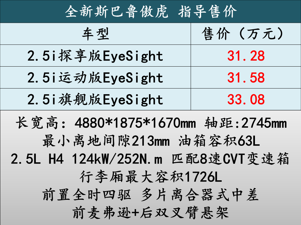 2021款斯巴鲁傲虎推出了3款车型,动力规格一致,售价区间为31.28~33.08万元。尺寸达到中型SUV标准,1670mm的车高让其有些像跨界SUV,最小离地间隙达到了213mm,配备全时四驱系统,在通过性和越野能力上会有不错的表现。水平对置发动机能提供更好的平衡性,CVT更加平顺稳定,空间还是很大的。