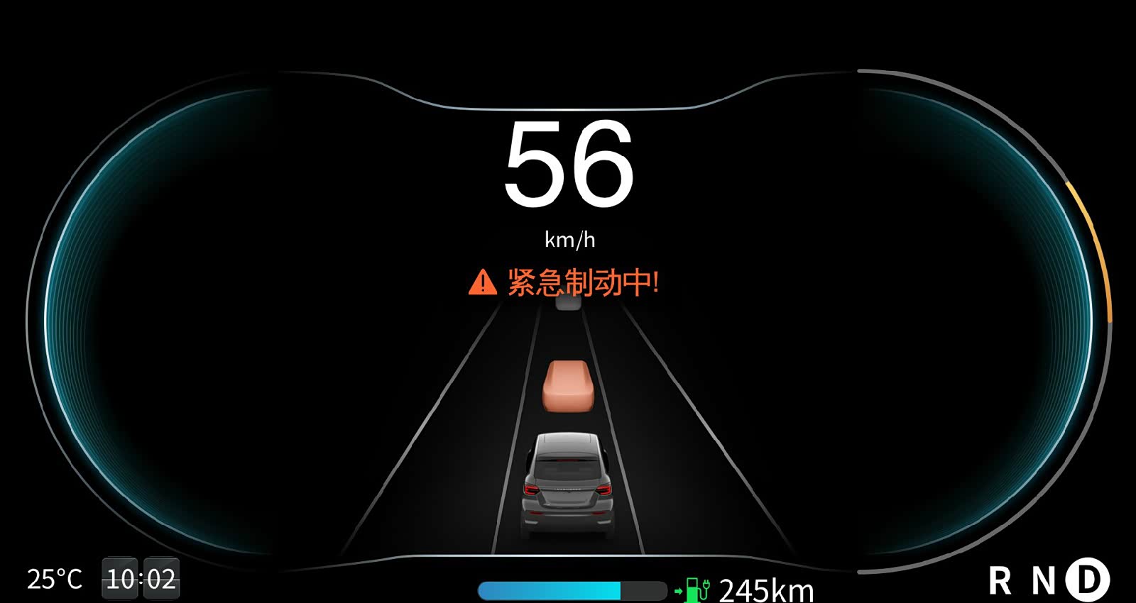在AEB自动紧急制动系统功能启动后,车辆正常行驶中如遇突发危险情况或与静止状态下的前车距离小于安全距离时,系统能够主动刹车。