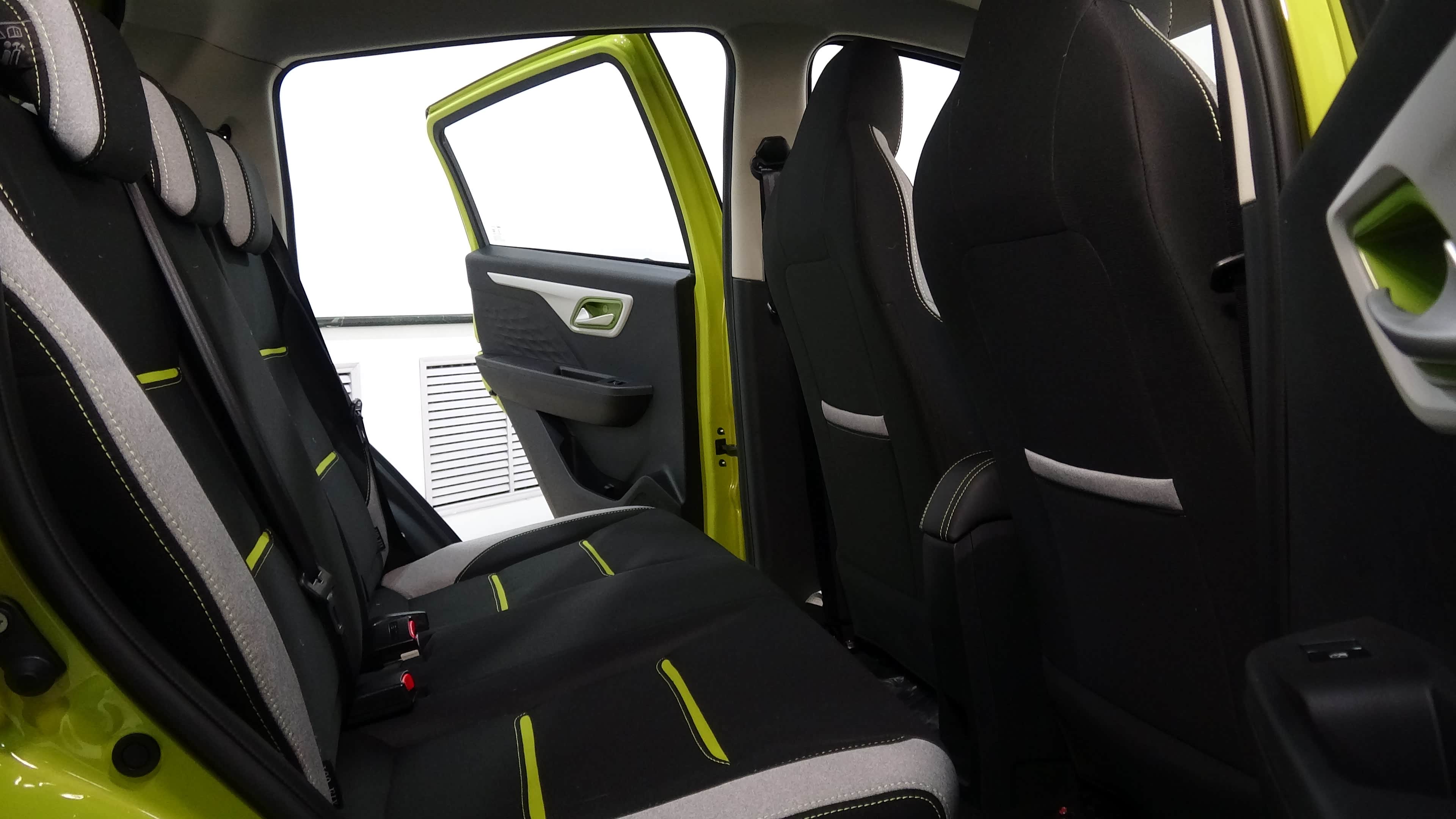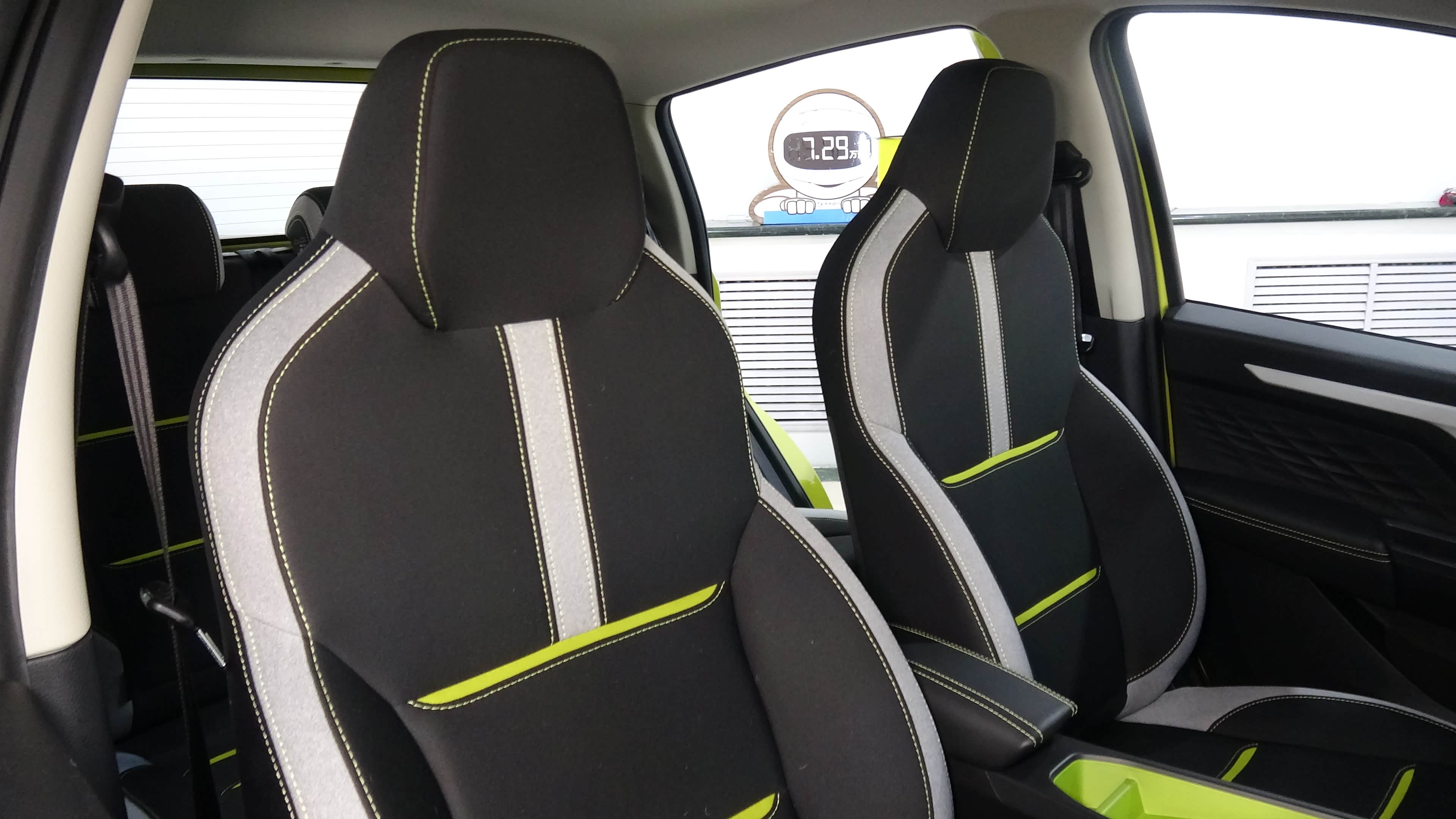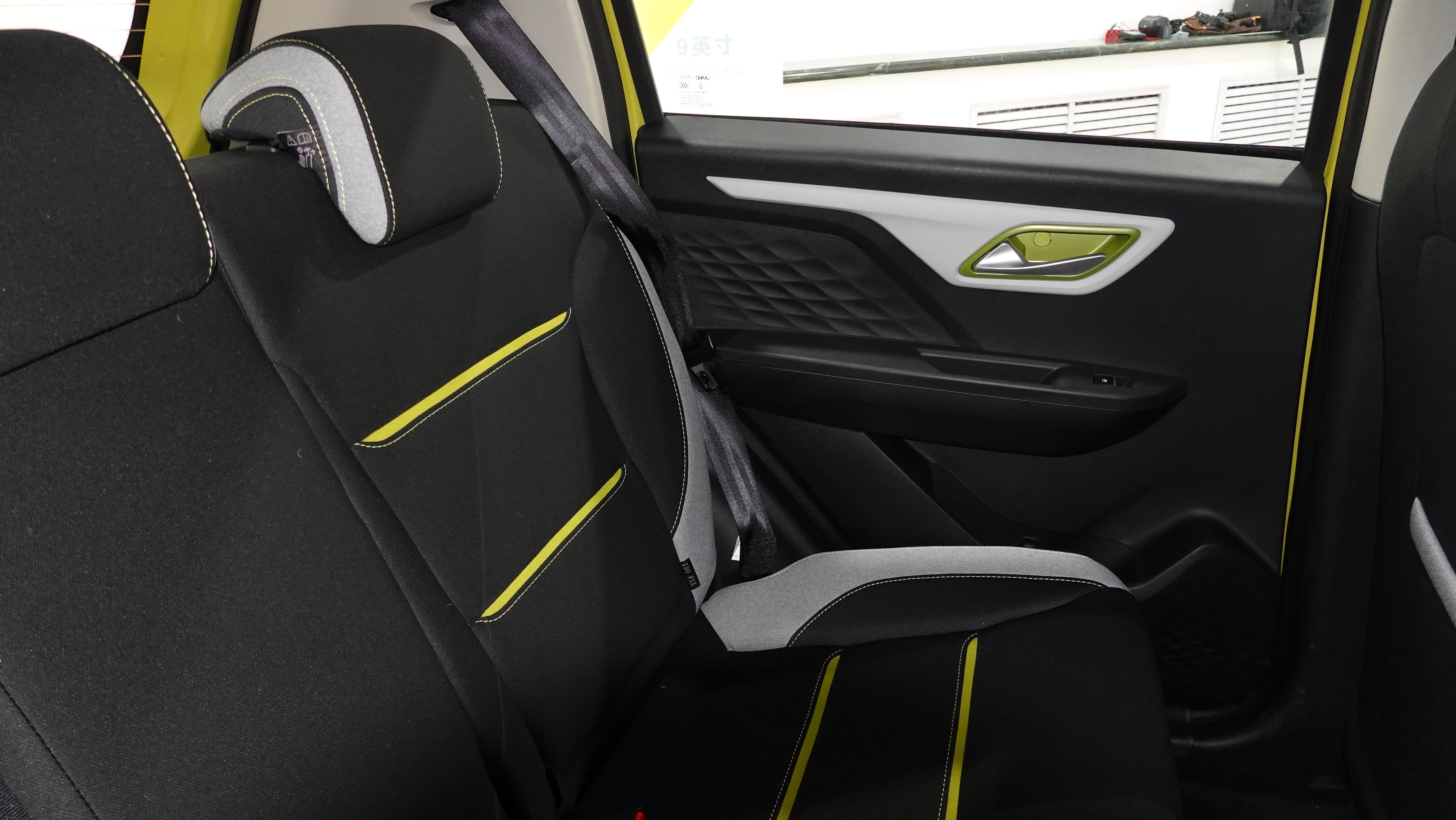 座椅是一个运动风格的造型,和内饰一致,采用黑白绿色相搭配,材质为织物,带有绿色缝线,顶配版本的座椅为仿皮材质。