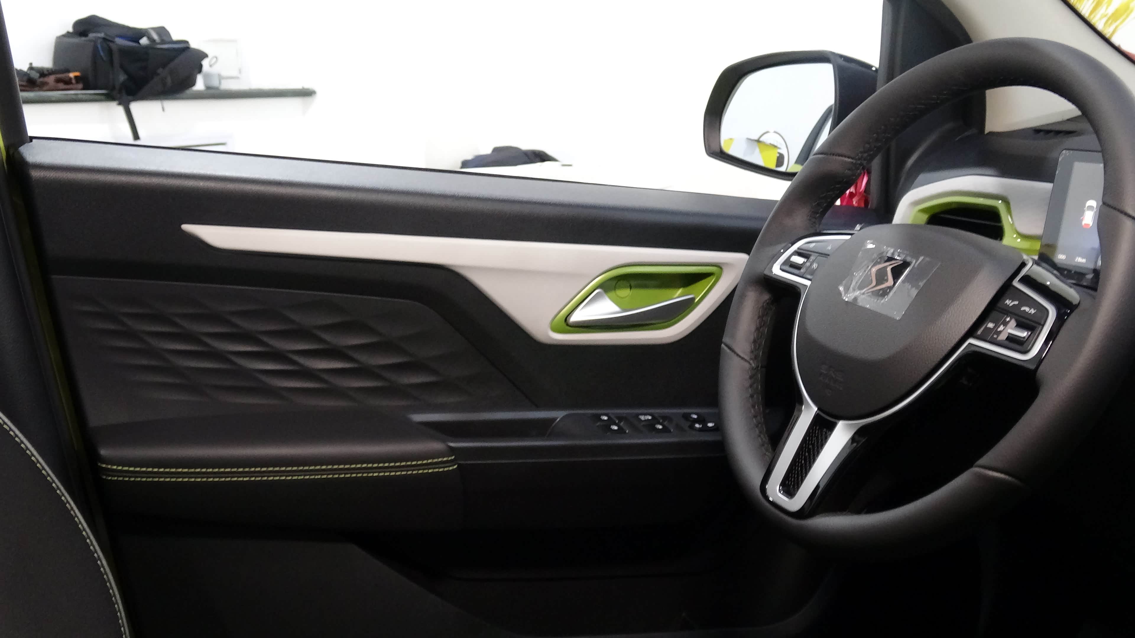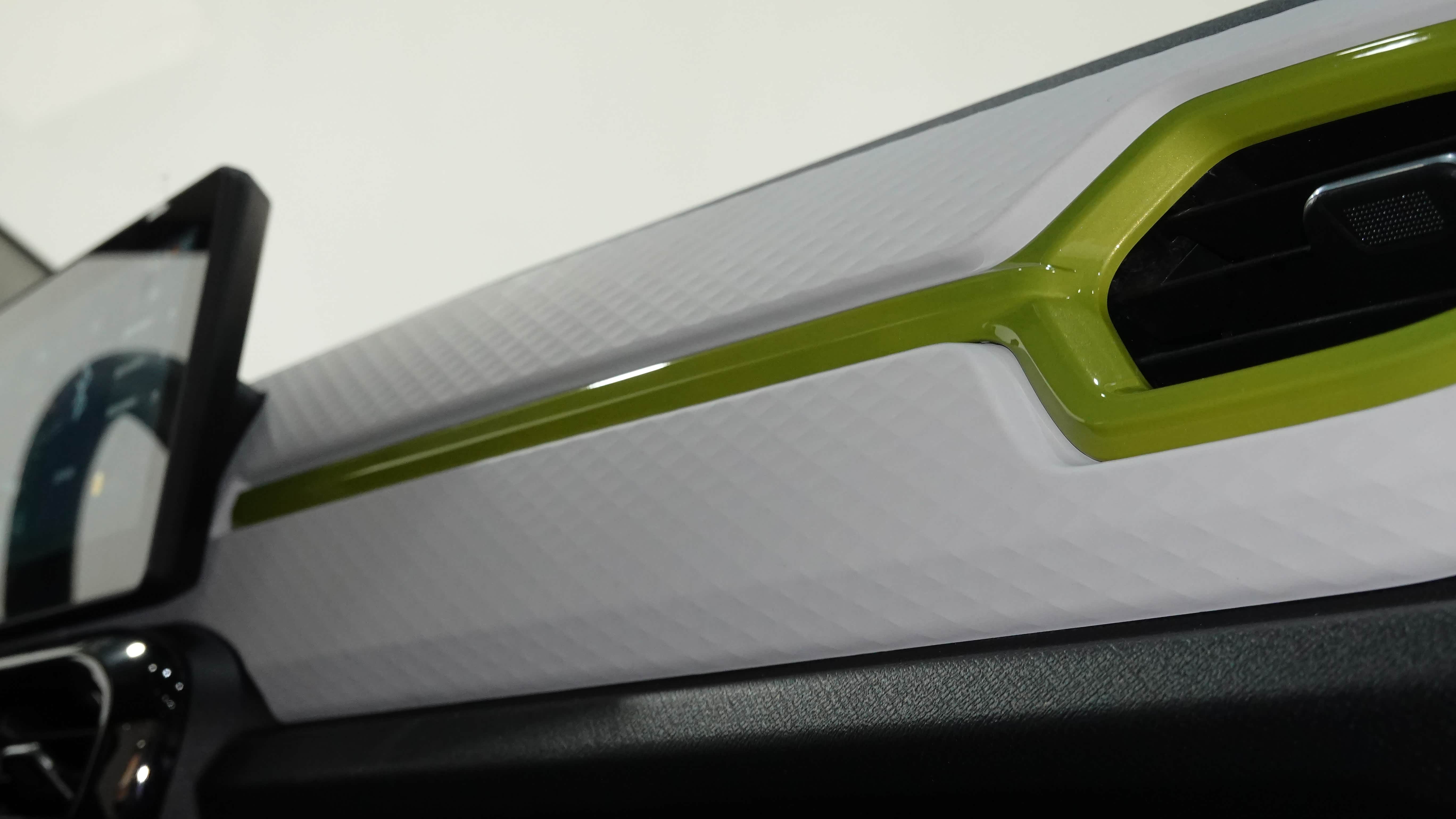 在车内的几处细节位置,官方运用激光雕刻的技术还加入了纹理设计,包括门板上方的位置以及前方白色的装饰面板上都能看到,这样的设计在微型车中并不多见,可见设计师还是花了不少心思。