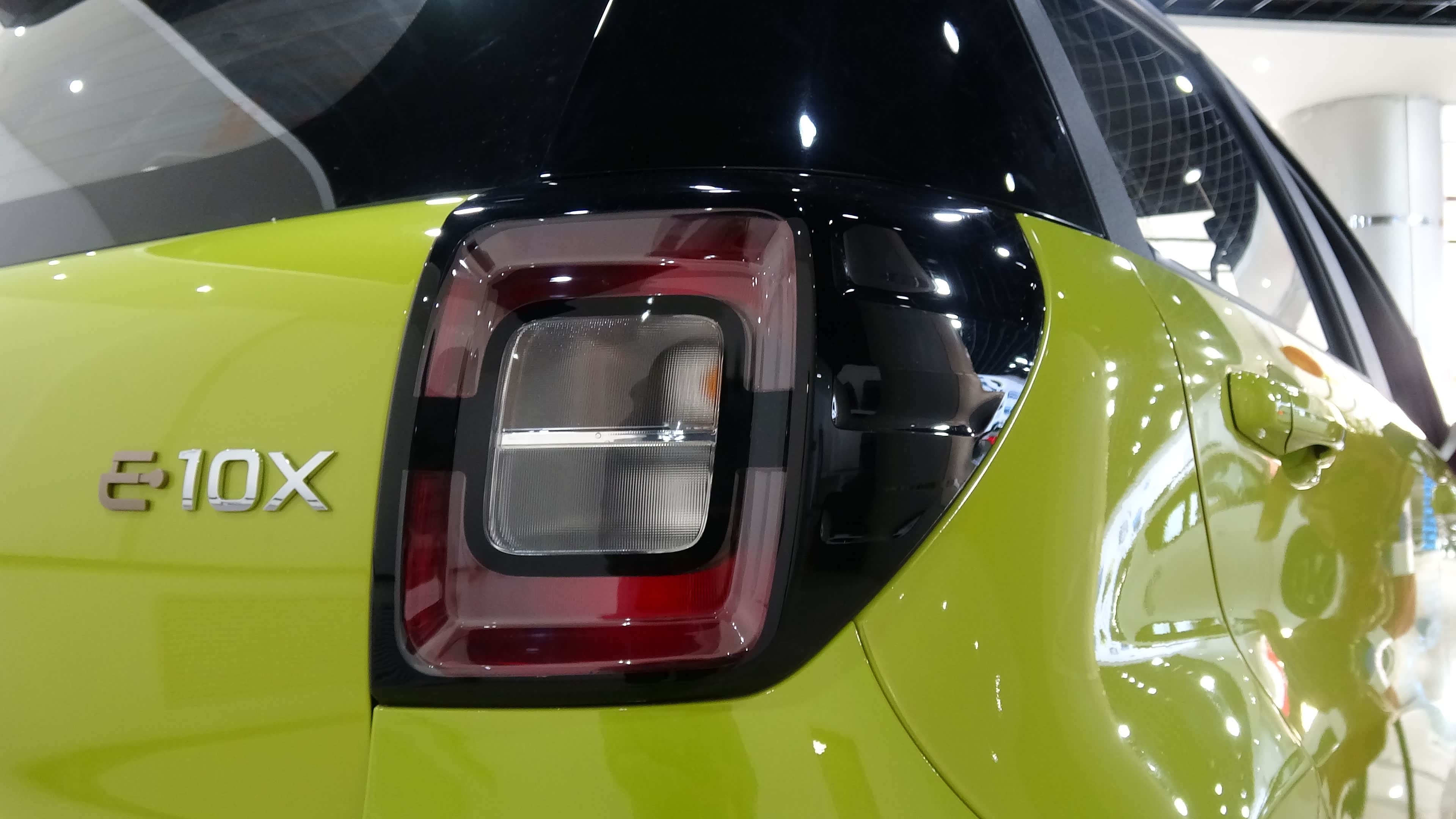 来到车尾,车尾的设计相对简洁明了,双色车身的优势显现出来,并不会在视觉上让车尾显得单调,同时,后包围同样采用了C字形的黑色饰条进行点缀,与前包围相呼应,进一步增加了它的辨识度。细节方面,江汽集团和E10X的LOGO被放在了两侧对称的位置。
