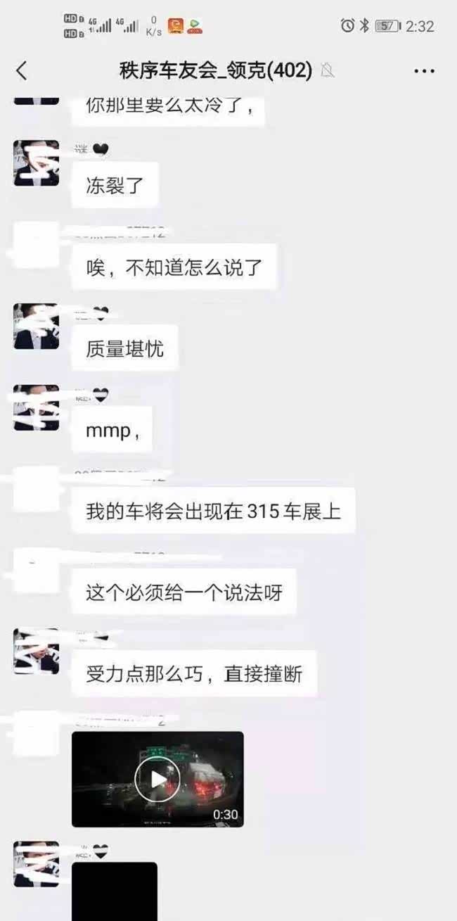 还有一张名为“秩序车友会-领克(402)”的截图,图中有人称“质量堪忧”,有的说“你那里要么太冷了,冻裂了”,还有的发出质疑“受力点那么巧,直接撞断”。貌似车主也在群中留言“我的车将会出现在315车展上”(见下图)。