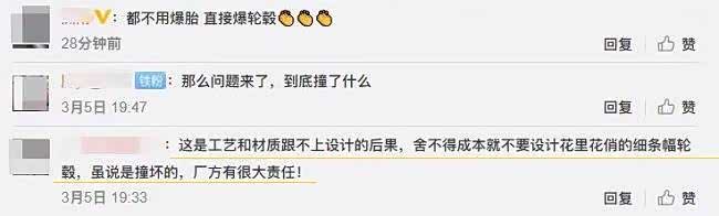 网友也评论称,“这是工艺和材质跟不上设计的后果,舍不得成本就不要设计花里胡哨的细条幅轮毂,虽说是撞坏的,厂方有很大责任!”(见下图)