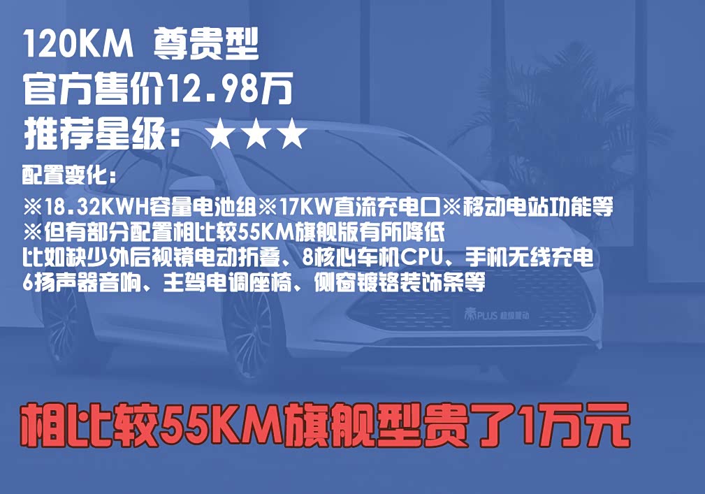 120km 尊贵型,官方售价12.98万元,相比较55km旗舰型贵了1万元,配置变化包含:18.32kwh容量电池组、17kW直流充电口、移动电站功能等。但有部分配置相比较55km旗舰版有所降低,比如缺少外后视镜电动折叠、8核心车机CPU、手机无线充电、6扬声器音响、主驾电调座椅、侧窗镀铬装饰条等。