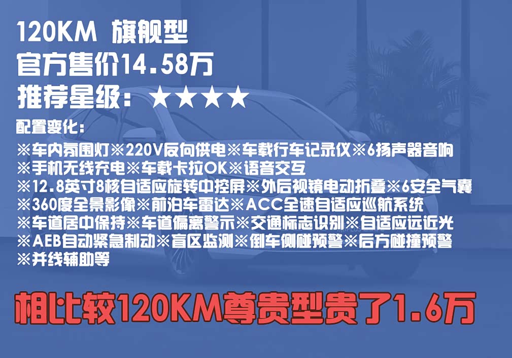 120km 旗舰型,官方售价14.58万元,相比较120km尊贵型贵了1.6万,配置变化包含:车内氛围灯、220V反向供电、车载行车记录仪、6扬声器音响、手机无线充电、车载卡拉OK、语音交互、12.8英寸8核自适应旋转中控屏、外后视镜电动折叠、6安全气囊、360度全景影像、前泊车雷达、ACC全速自适应巡航系统、车道居中保持、车道偏离警示、交通标志识别、自适应远近光、AEB自动紧急制动、盲区监测、倒车侧碰预警、后方碰撞预警、并线辅助等。