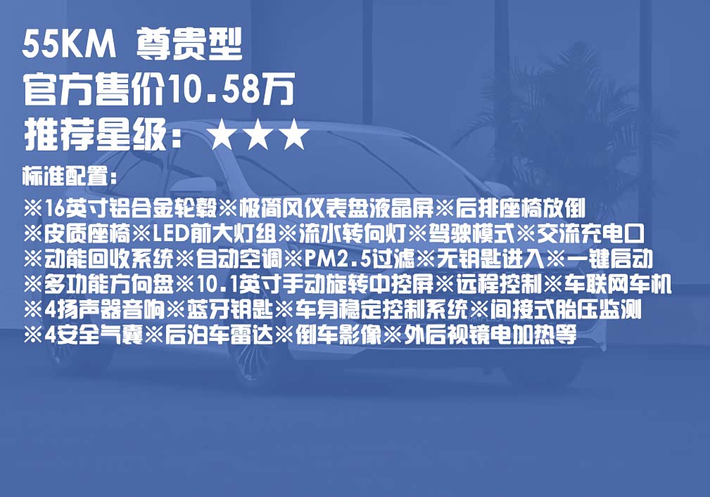 55km 尊贵型,官方售价10.58万元,标准配置包含:16英寸铝合金轮毂、极简风仪表盘液晶屏、后排座椅放倒、皮质座椅、LED前大灯组、流水转向灯、驾驶模式、交流充电口、动能回收系统、自动空调、PM2.5过滤、无钥匙进入、一键启动、多功能方向盘、10.1英寸手动旋转中控屏、远程控制、车联网车机、4扬声器音响、蓝牙钥匙、车身稳定控制系统、间接式胎压监测、4安全气囊、后泊车雷达、倒车影像、外后视镜电加热等。