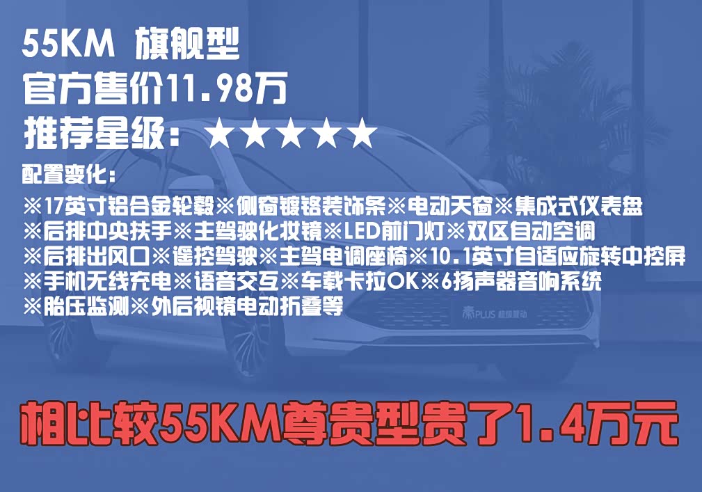 55km 旗舰型,官方售价11.98万元,相比较55km尊贵型贵了1.4万元,配置变化包含:17英寸铝合金轮毂、侧窗镀铬装饰条、电动天窗、集成式仪表盘、后排中央扶手、主驾驶化妆镜、LED前门灯、双区自动空调、后排出风口、遥控驾驶、主驾电调座椅、10.1英寸自适应旋转中控屏、手机无线充电、语音交互、车载卡拉OK、6扬声器音响系统、胎压监测、外后视镜电动折叠等。