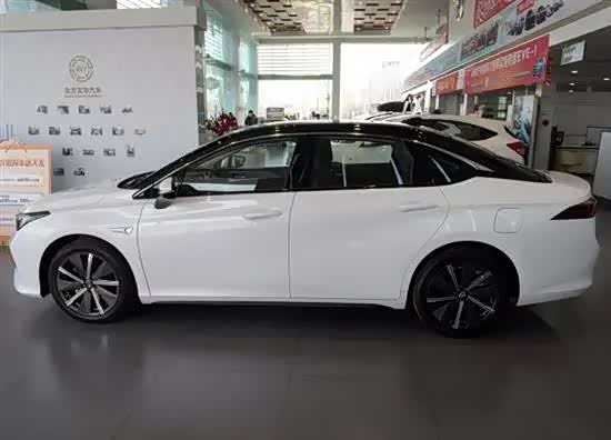 视角转向侧面,新车采用了双色车身设计,黑色车顶搭配白色车身,造型上显得十分协调,流线型的车顶设计犹如一款轿跑车型。侧面腰线从前翼子板一直贯穿至车尾部分,营造出一种蓄势待发的状态。新车还搭配了一款密条辐低风阻轮毂,符合新能源车的一贯设计。车身尺寸方面,新车长宽高分别为4800/1880/1530mm,轴距为2750mm。