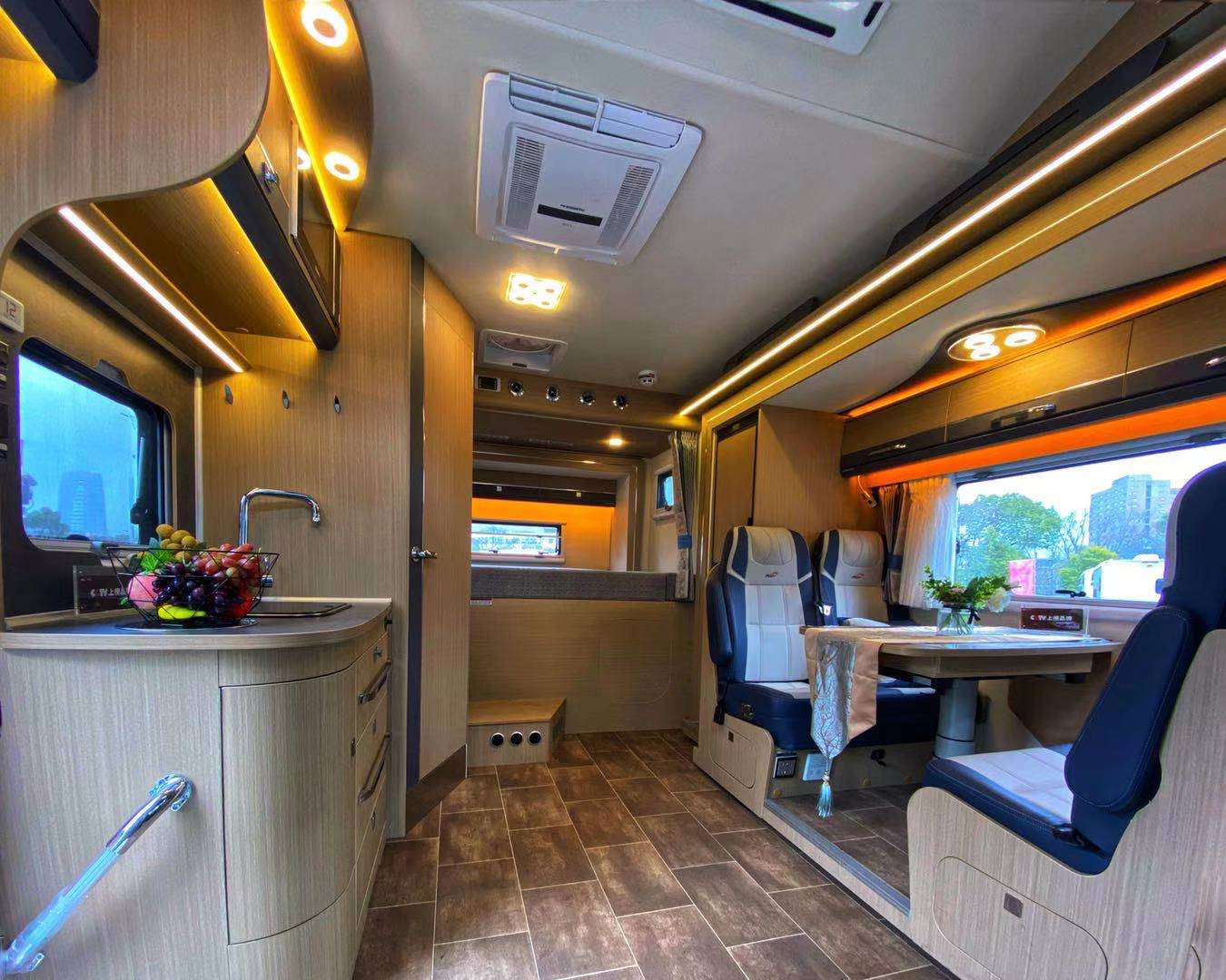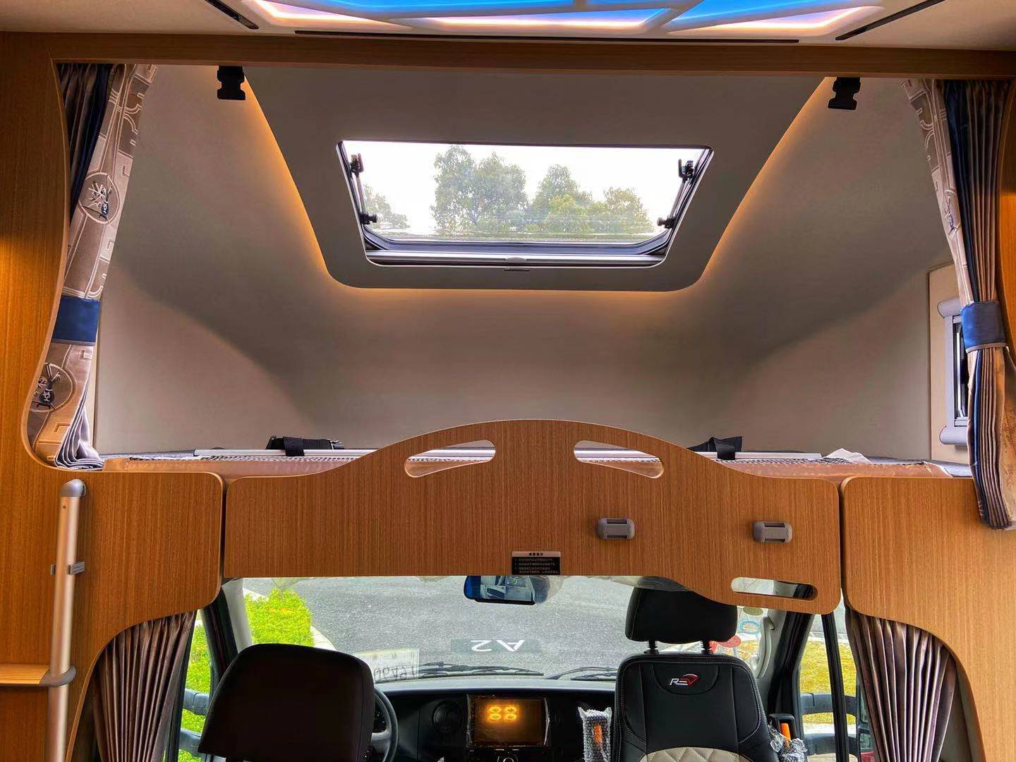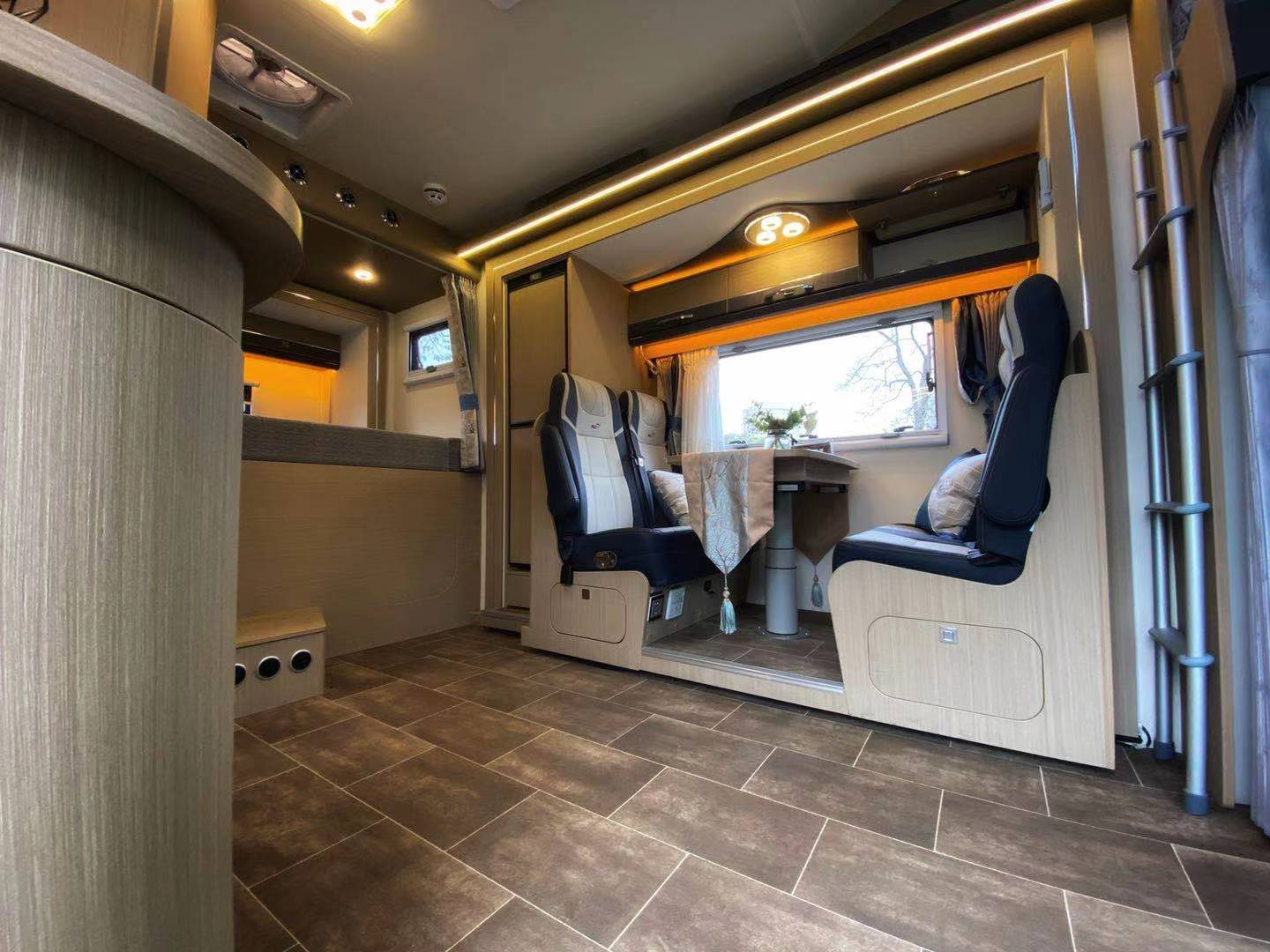 该车采用了大额头的设计形式,车尾和左侧车身可拓展,拓展机构均为美国进口的产品,车身也是高强度铝合金结构,顶部采用了“屋脊”式一体成型符合材料双层车顶。外部还配置了进口风感自动收回电动遮阳棚,两点式驻车平衡器,中门采用房车专用门,带有电动踏步。