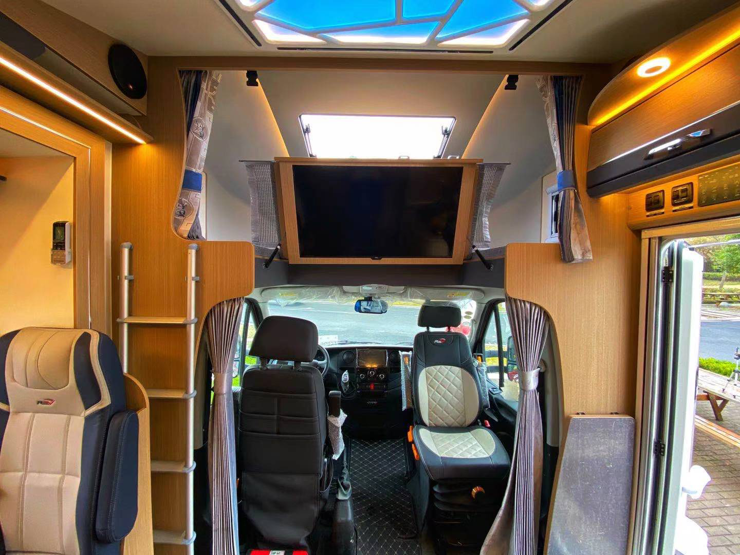 前部额头区域安装了一台40寸超大液晶电视,匹配JBL音响系统和车载WIFI,娱乐功能一个都不少。电视放下以后就是非常宽敞的额头床,卧铺区域均安装了高档私密拉帘,床铺都是高密度海绵床垫。