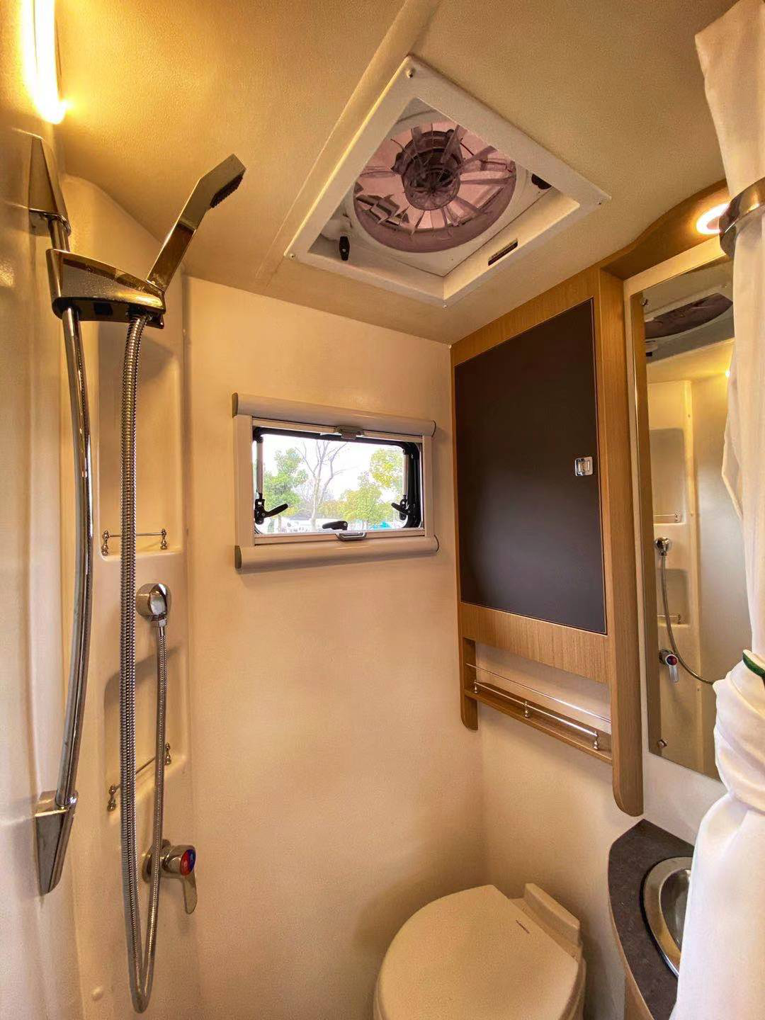 浴室配置也非常豪华,基本的马桶、喷头、不锈钢洗手池、化妆镜、储物台都一应俱全,另外该车采用全自动水路,200升净水箱,50升灰水箱和50升黑水箱。多功能的豪华卫浴给人非常良好的享受。