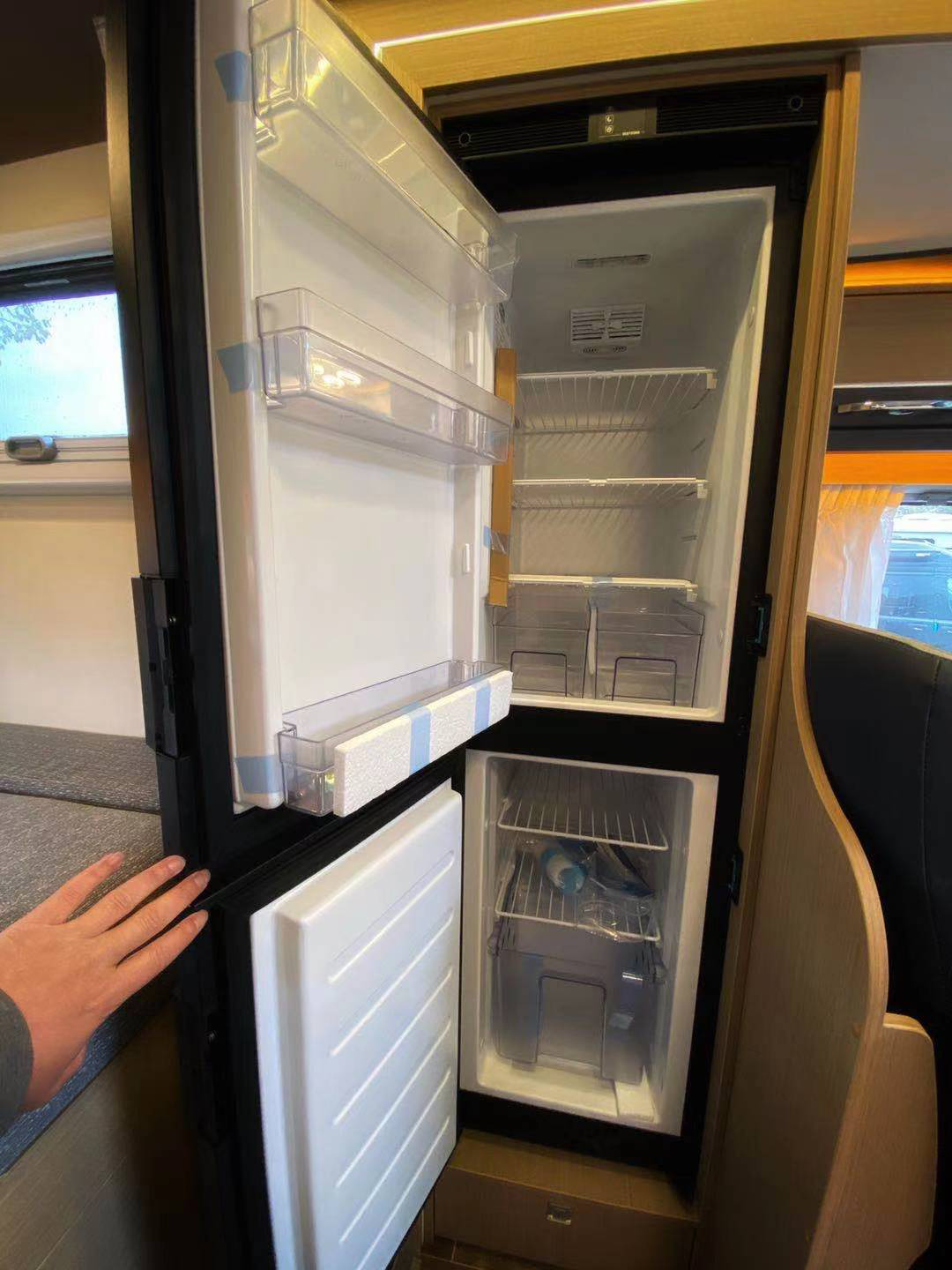 另外该车还带有进口的双开门房车专用冰箱,冰箱拥有86.5升的冷藏舱和55升的冷冻仓,双仓独立,空间非常大。