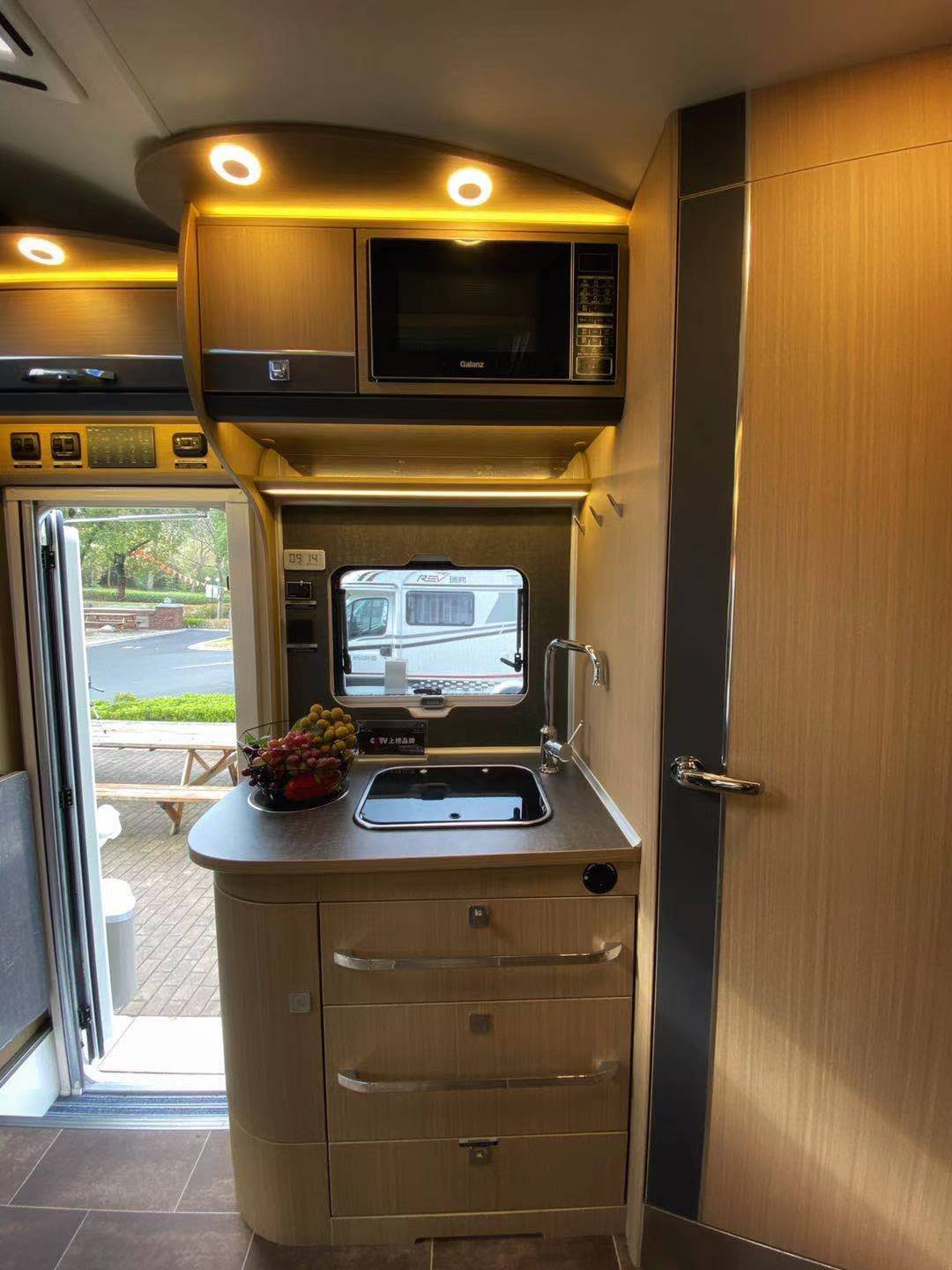 厨房功能配置非常齐全,下面是全铝碗碟收纳架,中间安装了不锈钢洗手池,上面还有微波炉,瑞弗V820还配备了线控镶嵌式电磁炉问。车厢外面还有抽拉式的燃气灶具,烹调设备一应俱全。