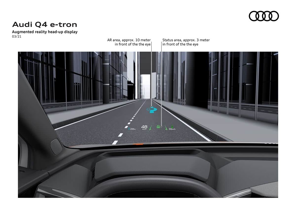 例如,奥迪Q4 e-tron可选装的AR-HUD(增强现实抬头显示)系统,从驾驶员的角度来看,AR部分视场的效果相当于对角线约70英寸的显示。在其下方是近距离平面显示窗口,呈现车况信息。该窗口以静态显示方式显示行驶速度、交通标志及辅助系统和导航符号。这些静态信息如同悬浮在驾驶员目视前方约3米处。而动态信息则投放在眼前十米左右的位置。