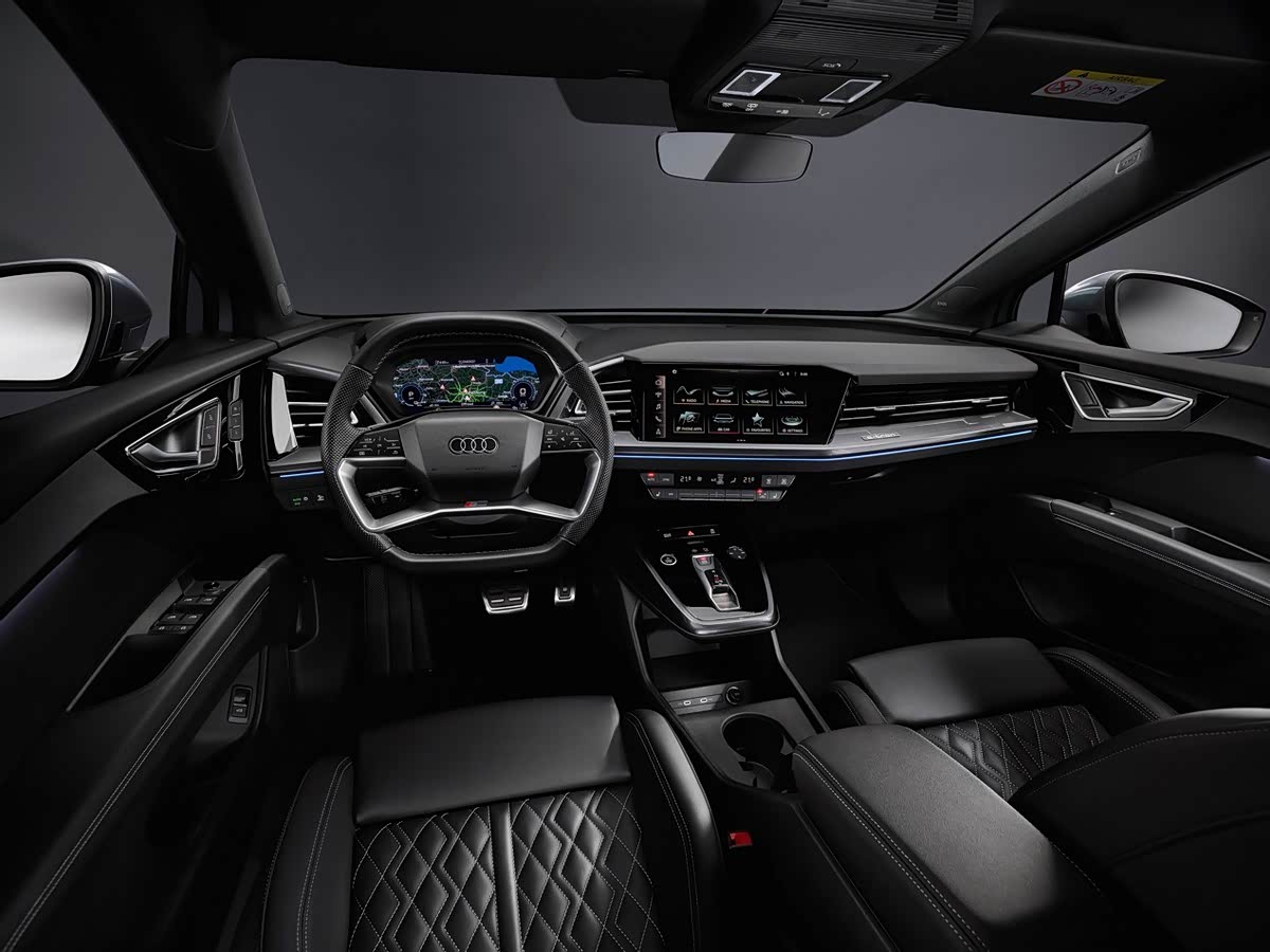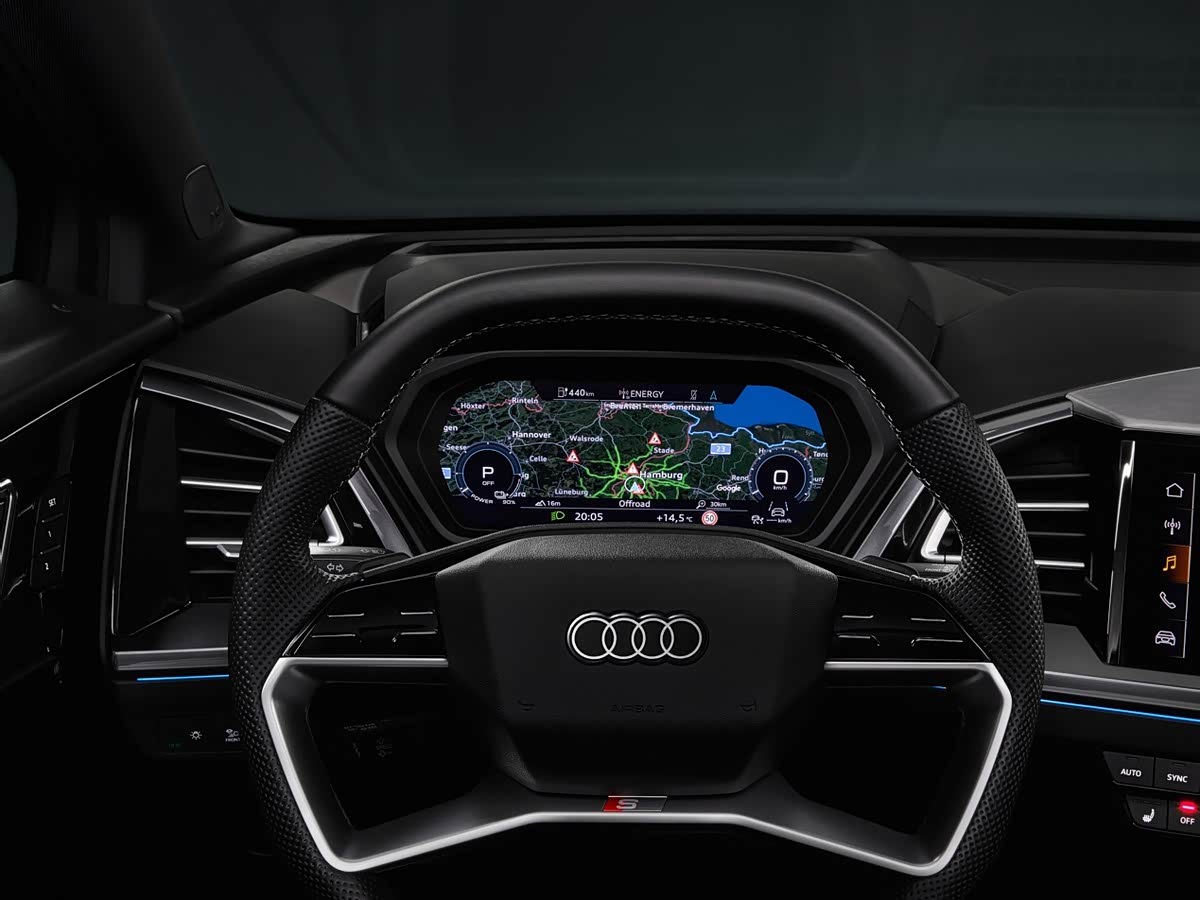 如果说8代高尔夫是大众品牌的数字化变革先锋,那奥迪Q4 e-tron绝对可以配得上奥迪家族这样的名号。打开车门,映入眼帘的是一派似曾相识,却又耳目一新的画风。相似的是一眼可以认出的中控屏倾向于驾驶员且棱角分明的环抱式座舱,不同的是方向盘,中控台甚至奥迪“四个圈”logo的设计都变了模样。