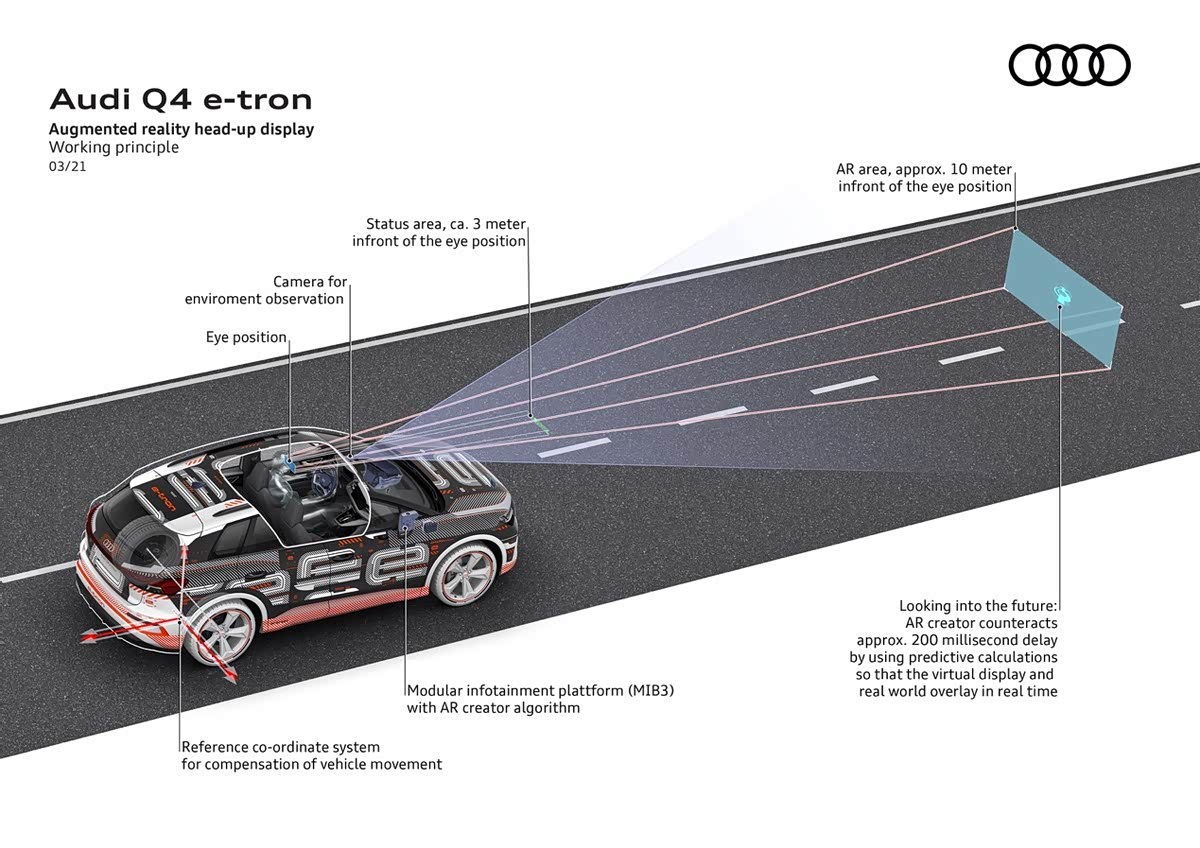 AR-HUD相对于普通HUD,一大重要区别是可以融合车辆传感器的数据,这就对车辆自身算力与传感器提出了重要要求。在Q4 e-tron上,为了营造良好的用户体验,其专门打造了一个预测图像生成器——AR Creator。AR Creator作为决策中心和软件端的图像生成器,是模块化信息娱乐平台(MIB 3)中的一个处理单元,由多个单独的模块组成。AR Creator将以每秒60帧的速度渲染显示符号,并使这些符号适应投影光学系统的几何形状。同时,该单元计算这些符号相对环境的位置,并通过前置摄像头、雷达传感器和GPS导航的原始数据获取信息。其软件包含大约60万行编程代码,比第一代航天飞机的整个控制系统还多约50%。