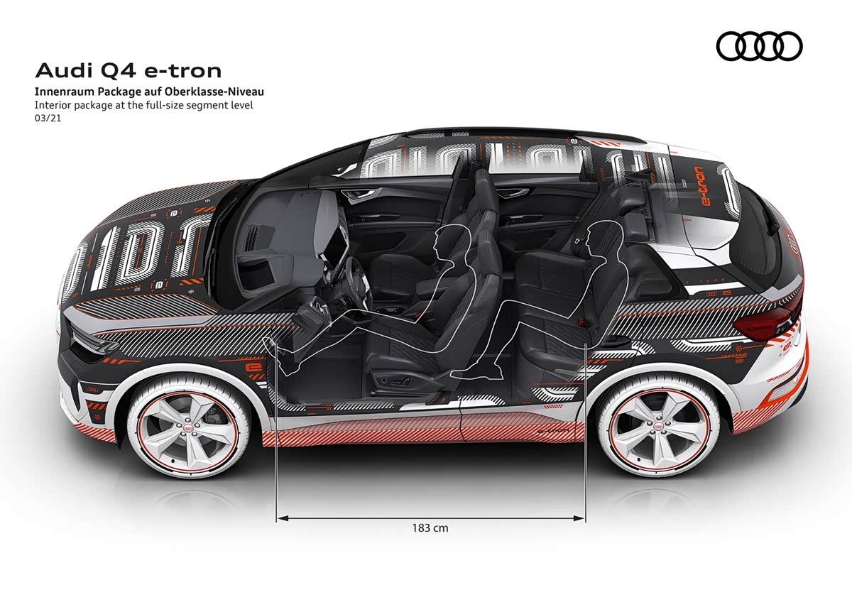 说起Q4 e-tron,从命名上看,它应该是一辆比Q3略大,比Q5稍小的SUV产品。但是从BAO师傅拿到的数据来分析,这款车型在三围尺寸上就很有看头。这里我们先来比较一组数据。奥迪Q4 e-tron长4,590毫米,宽1,865毫米,高1,613毫米。这样的长宽高在A级SUV里已经可以算得上是佼佼者,与上一代Q5 4629毫米×1898毫米×1655毫米的尺寸比,只是在车长和车高上略有出入,在宽度上实现反超,而轴距已然达到了2760mm,与上一代Q5的2807mm轴距相差47mm(4·7厘米)。得益于MEB平台的架构支持,其前悬该车前悬长度仅为86厘米,达到中型SUV水平,而车内空间总长则达到1.83米,几乎快赶上了大型全尺寸SUV。这样的小尺寸,大空间,是纯电动车型专属平台的优势,这样的优势在BBA三家中唯奥迪独有,而且将很快在其纯电动系列中普及。