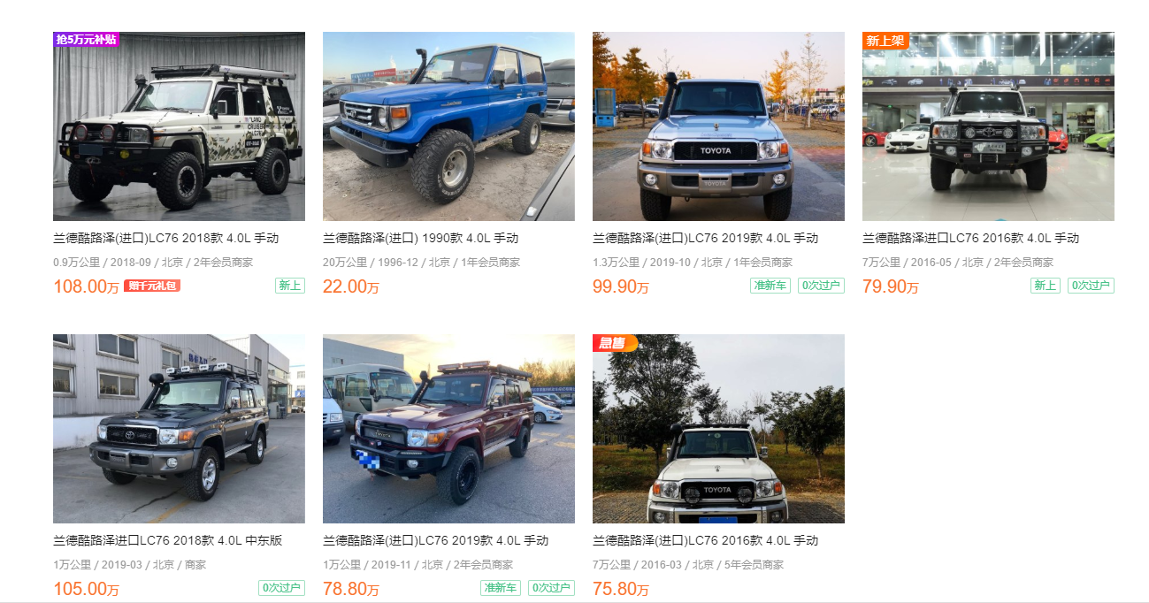 但正在发生的事实显然不是这样:就二手越野车市场来看,不管是丰田陆巡,还是路虎发现4,抑或是铃木吉姆尼,二手车市值均有着明显的价格上浮, 兰德酷路泽老款LC76更是从50多万摇身一变,市值直飙至近百万。