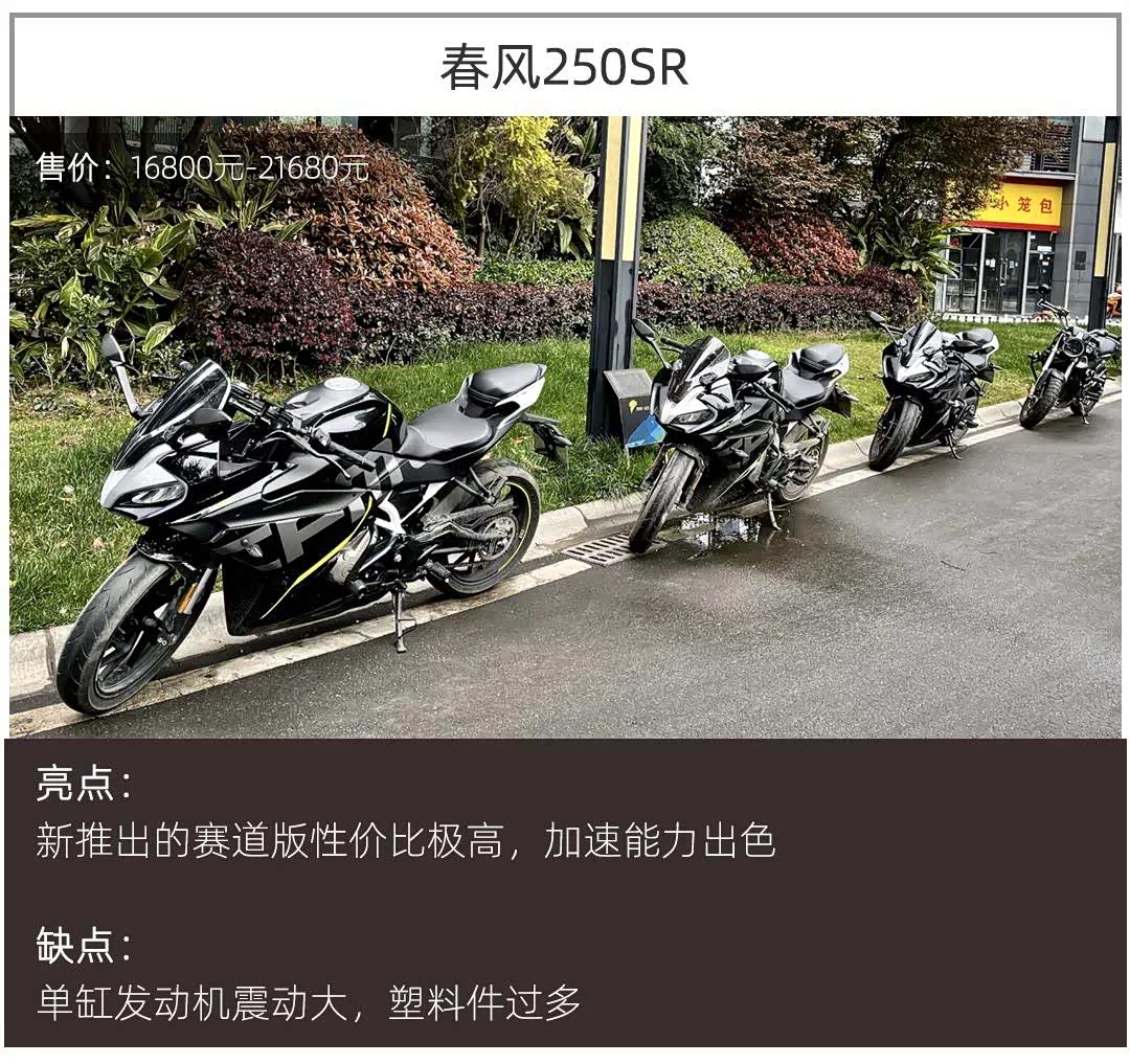这张图摄于蜀锦传媒办公楼下,从左到右的三款车型皆为春风250SR,如此高的热度让我们不得不把它排列在入门级仿赛车型的推荐首位。春风250SR这款车从上市初期到现在皆是摩托车市场的焦点,主要原因在于外观造型不错,春风品牌的口碑较好,并且7秒多的百公里加速对于一辆入门级车型,也是较为亮眼的成绩,因此春风250SR也就成为了当下的网红车。