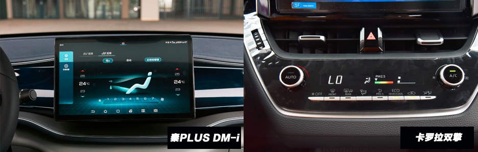 内饰对比:秦PLUS DM-i车机功能丰富,卡罗拉双擎硬塑材质居多