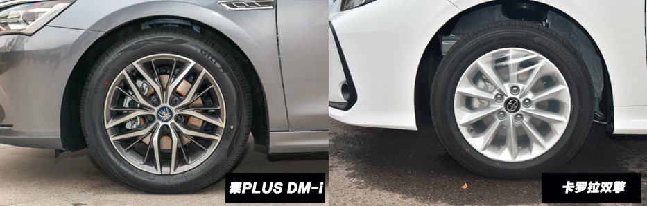 轮胎方面,秦PLUS DM-i配备的是17英寸铝合金轮毂,样式时尚精致。卡罗拉双擎配备的是16英寸铝合金轮毂,样式稍显普通。