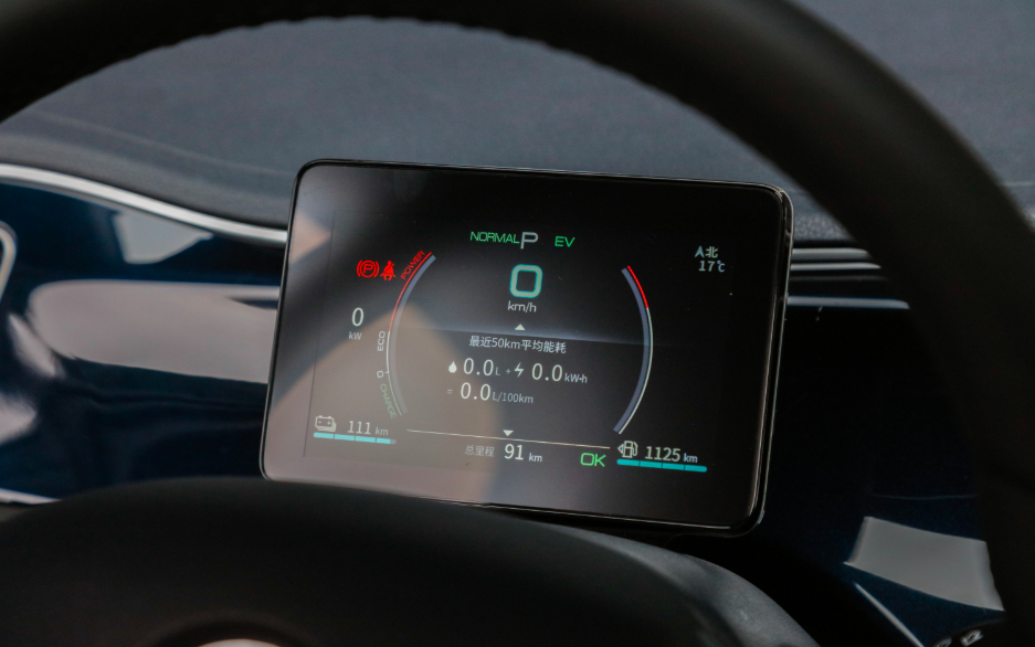 秦PLUS DM-i配备是全液晶仪表盘,虽然尺寸不大,但显示内容丰富,涵盖车速、胎压、电量、续航里程、油耗等。