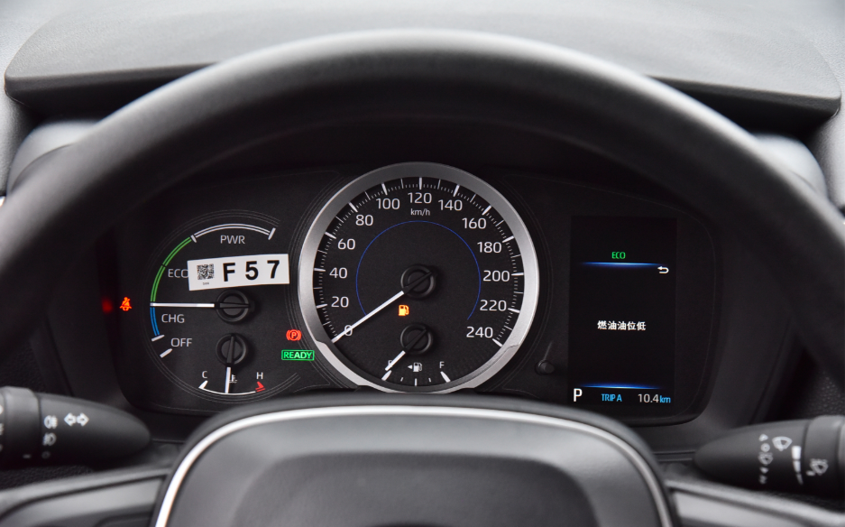 卡罗拉双擎配备的是常规机械式仪表盘,中间为传统指针仪表,左侧为混动发动机转速显示,右侧为4.2英寸液晶显示屏,可以显示胎压、车辆设定、多媒体、驾驶辅助等信息。