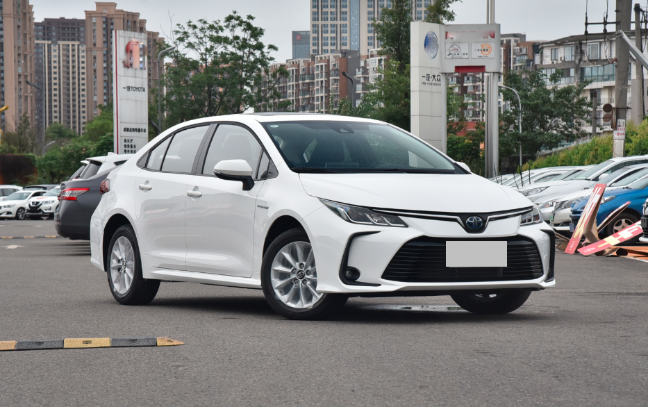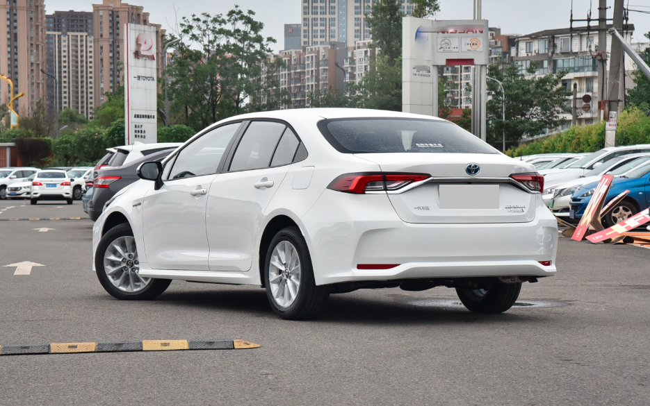 卡罗拉双擎采用大尺寸前格栅设计,内部为密集排列的横幅式饰条,进气口区域加入了黑色塑料装饰,提升了一定的运动感。锐利狭长的前大灯采用了卤素光源,并通过品牌Logo两端的银色镀铬衔接在一起,整体感较强。侧身采用前低后高的设计,营造出俯冲的视觉效果。尾部设计比较简约,红白相间的尾灯通过银色镀铬条衔接在一起,点亮后有着不错的辨识度。