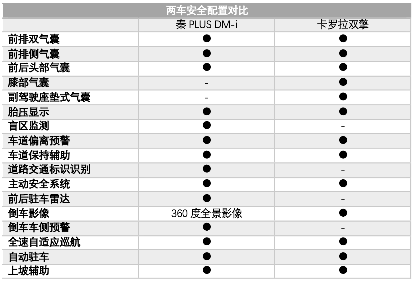 安全配置对比:秦PLUS DM-i驾驶辅助更丰富,卡罗拉双擎安全气囊更多