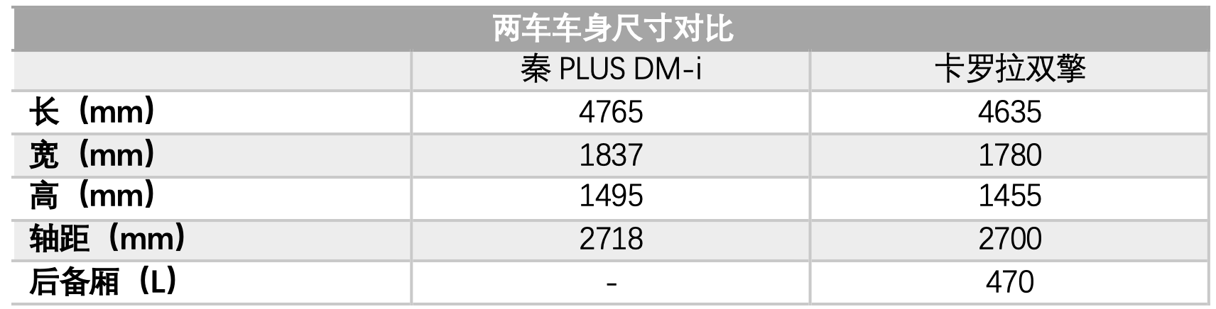 从车身数据来看,秦PLUS DM-i的整车尺寸均大于卡罗拉双擎,这也是大多数自主车型相较于合资车型的优势,不过两车都能满足日常家用需求。