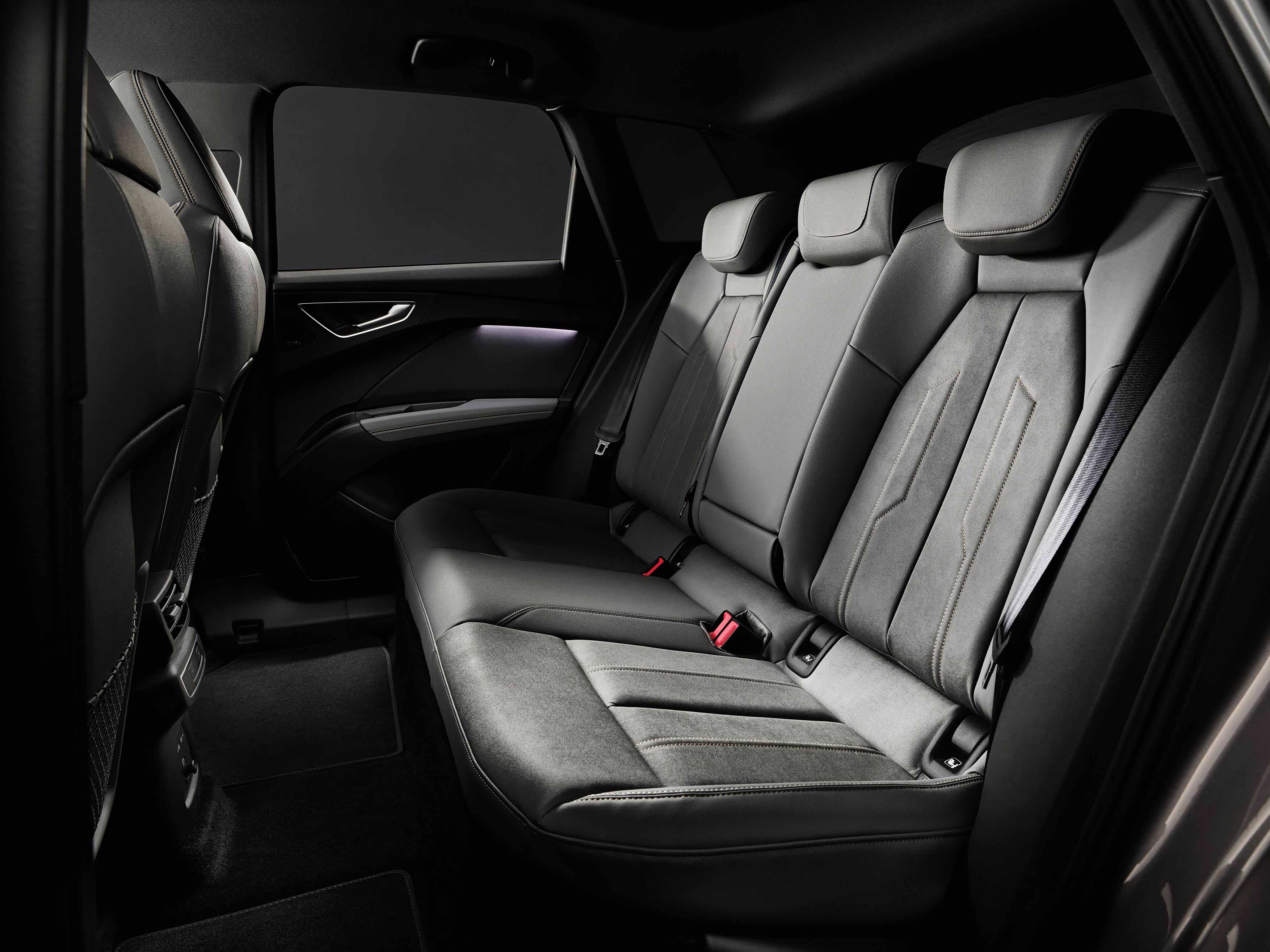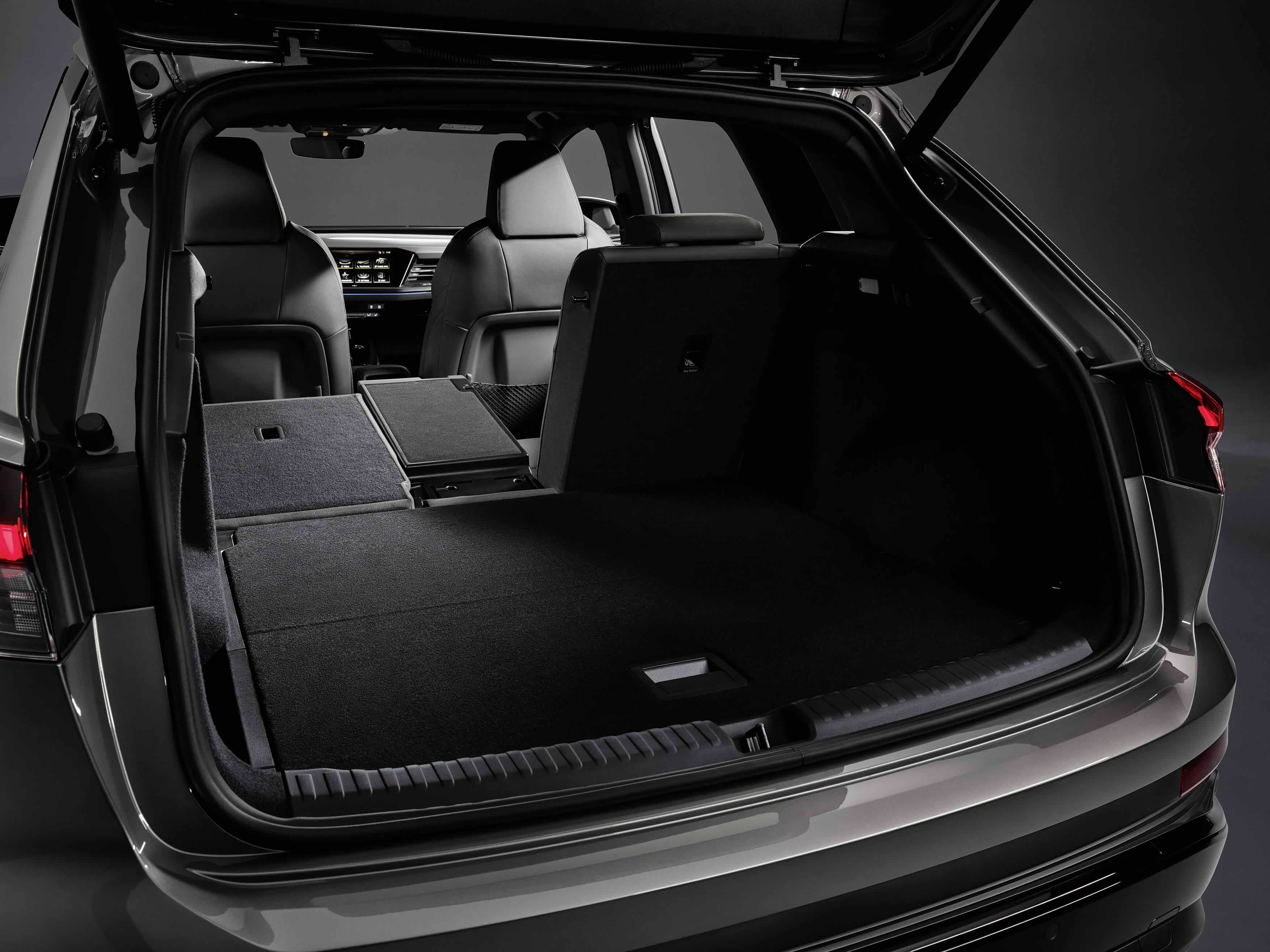 奥迪 Q4 e-tron 后备箱常规状态下容量为 520 升,后排座椅可按 40:20:40 的比例放倒,形成一个纯平的空间,扩展后最高容量可达 1,490 升,相当于中高档 SUV 的容量。用户还可按照自己的需求,选装隔离网和后备箱套件,包括内置两种高度的后备箱底板。