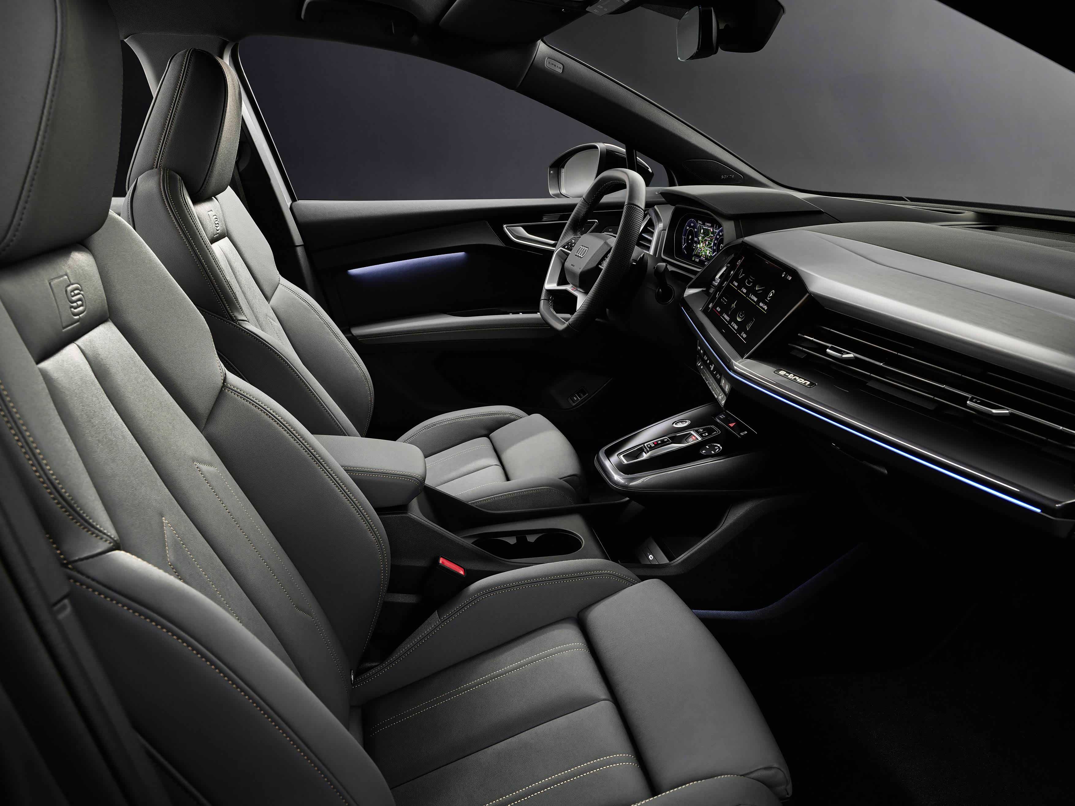 奥迪 Q4 e-tron 是一款真正的全路况车型和家用车型,内饰方面,拥有宽敞的储物空间,包括手套箱在内,容量高达24.8升(0.9立方英尺)。中控内设有两个杯架,一个扶手箱,容量为 4.4 升(0.2 立方英尺),两个 USB Type-C 接口以及一个用于放置移动电话的储物盒盒。在四扇车门的内饰上方,座椅扶手前端的正上方部位,均设有一个瓶架,可以放置容量为 1 升的瓶子,方便易取。
