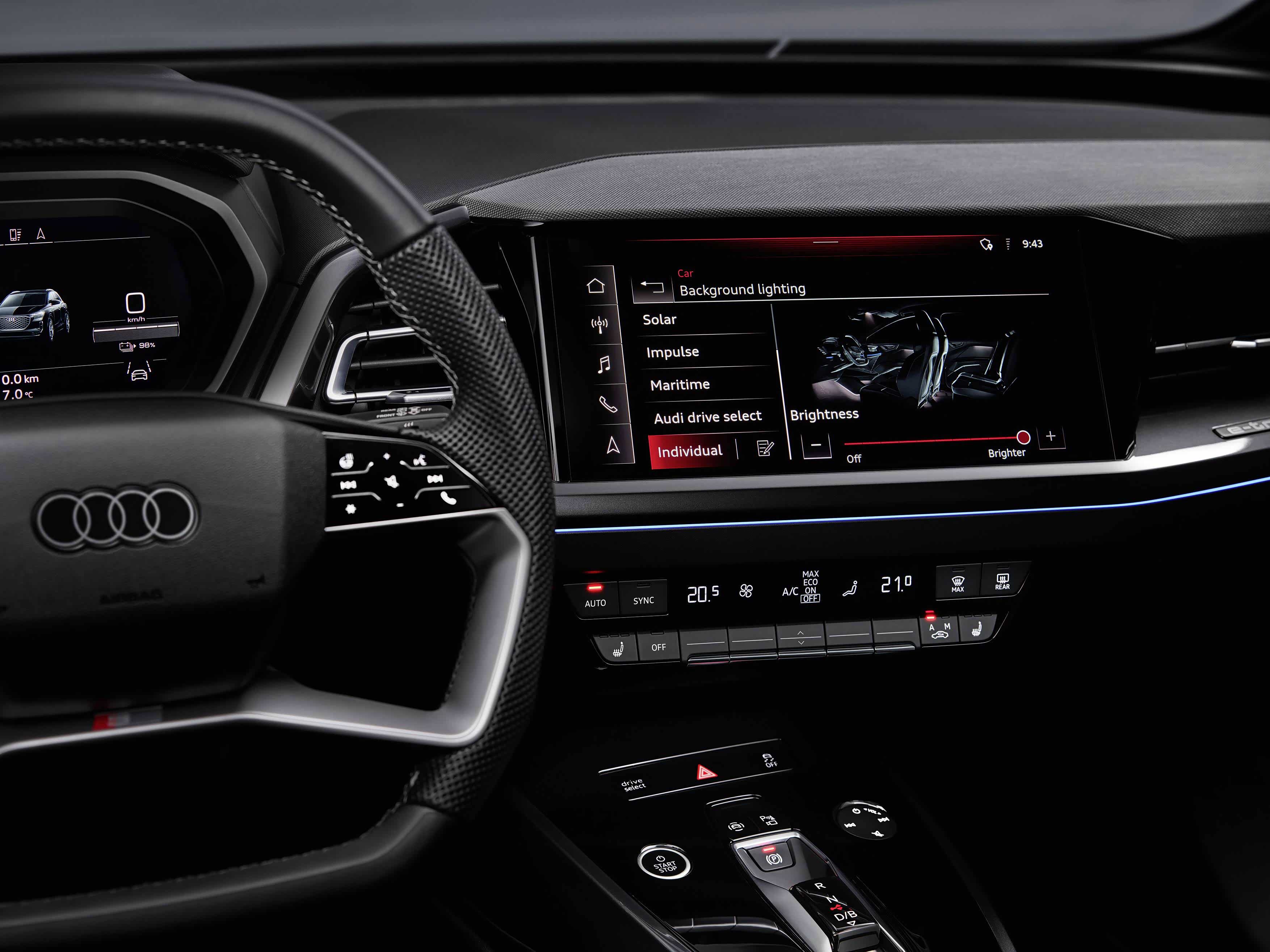 标配的数字化仪表盘达 10.25 英寸,通过多功能方向盘操控。在显示屏上,功率显示仪表盘位于速度显示仪表盘隔壁,显示了传动系统的所有重要信息,包括功率、充电百分比、能量回收值等。选配的奥迪虚拟座舱,包含导航图和信息娱乐操控等功能,驾乘人员可以在导航和信息娱乐操控场景中不断切换。