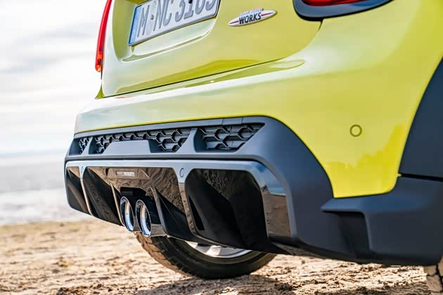 在新车两侧轮眉处以及车尾处还有 JOHN COOPER WORKS的特别的标识,表明了其JCW的特殊身份。尾部排气处的套件设计非常别致,突出了其性能车的运动感官。