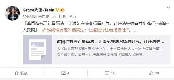 对此,特斯拉全球副总裁陶琳则在社交媒体上转发了一篇最高法的文章:“谁闹谁有理?”似乎暗指维权车主是“无理取闹”。