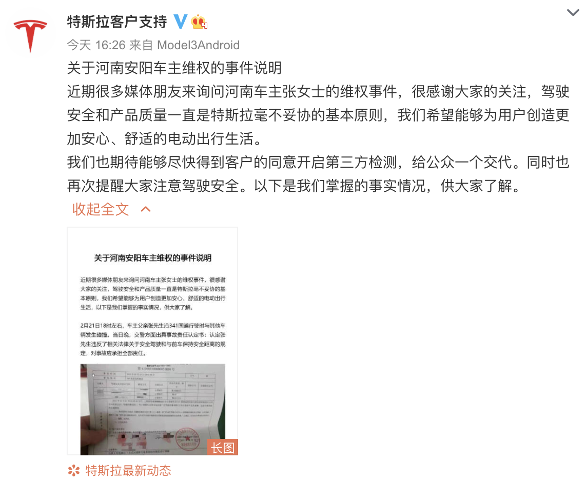 特斯拉在声明中表示,2月21日18时左右,车主父亲张先生沿341国道行驶时与其他车辆发生碰撞。当日晚,交警方面出具事故责任认定书:认定张先生违反了相关法律关于安全驾驶和与前车保持安全距离的规定,对事故应承担全部责任。