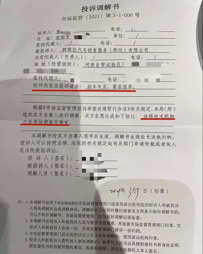 在此之后,特斯拉与张女士多次沟通仍然未果,最终在市监局工作人员的劝解下,终于同意选择第三方检测技术机构后协商鉴定事宜,并签署调解书。