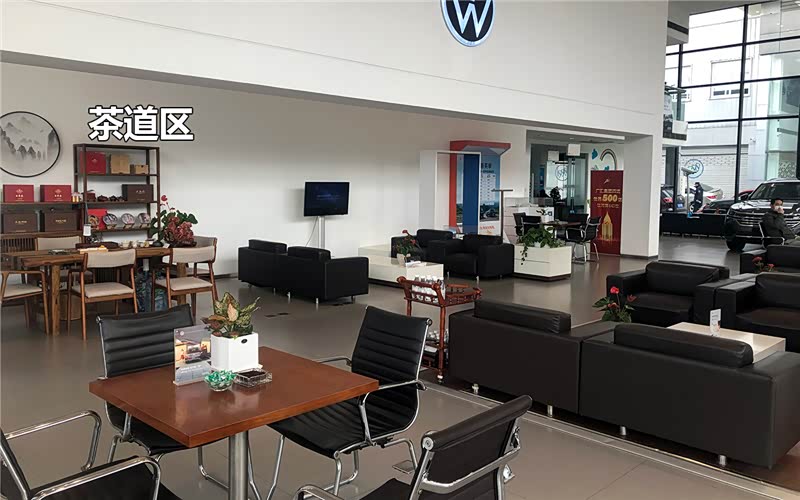 在展厅内,进口大众是当天探店中唯一设有室内高尔夫和功夫茶道的品牌,这样的陈设我相信跟用户类型有关。不过,从洽谈区的座椅和客休区的装潢来看,或许可以升级一下了,有点掉档。