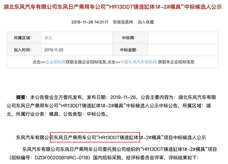 值得一提的是,日产汽车已经完成了名为“HR13DDT”的铸造钢体招标工作,而这个缸体就是这台1.3T发动机主体部件之一,意味着这台小排量四缸机的国产化进程已经进入最后阶段,按照进度,预计2021年就会在新一代日产逍客上服役。