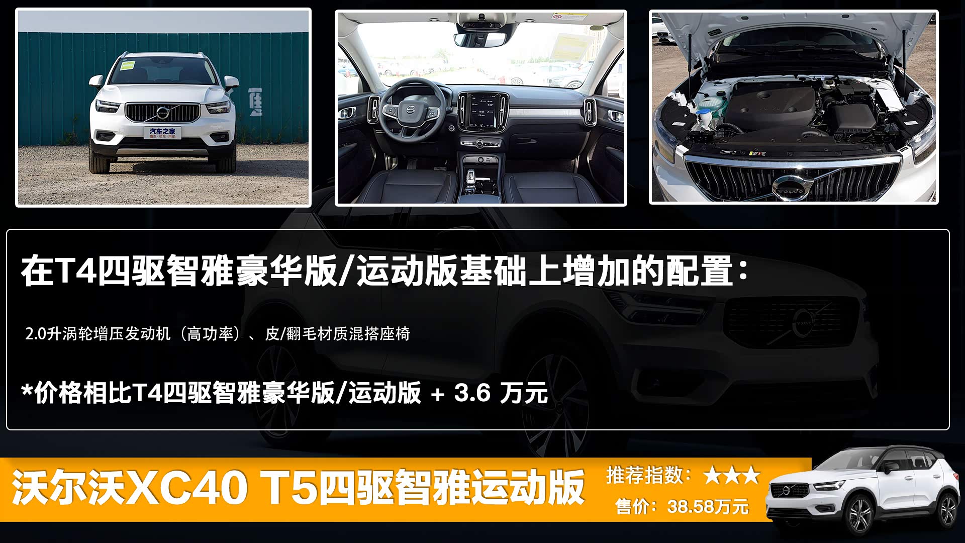 作为全系的顶配车型,T5四驱智雅运动版比T4四驱智雅豪华版/运动版贵了3.1万元,配置方面除了发动机改为2.0升涡轮增压发动机(高功率)之外,配置方面只改变了皮/翻毛材质混搭座椅,其他均没有变化。顶配车型,确实配置和动力表现都很好,当然价格也不低。