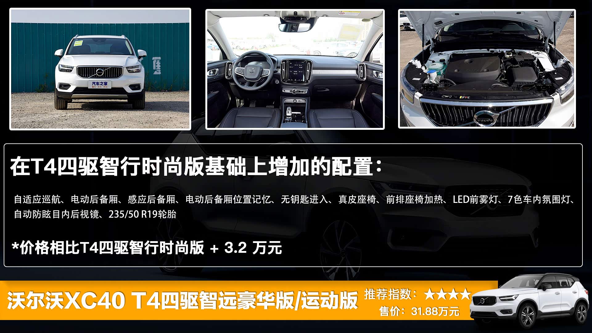与T4四驱智行时尚版相比,T4四驱智远豪华版/运动版在配置方面增加了自适应巡航、电动后备厢、感应后备厢、电动后备厢位置记忆、无钥匙进入、真皮座椅、前排座椅加热、LED前雾灯、7色车内氛围灯、自动防眩目内后视镜、235/50 R19轮胎,价格方面则增加了3.2万元。虽然配置方面有所提升,但是个人认为这些配置基本都是锦上添花型配置,可有可无。