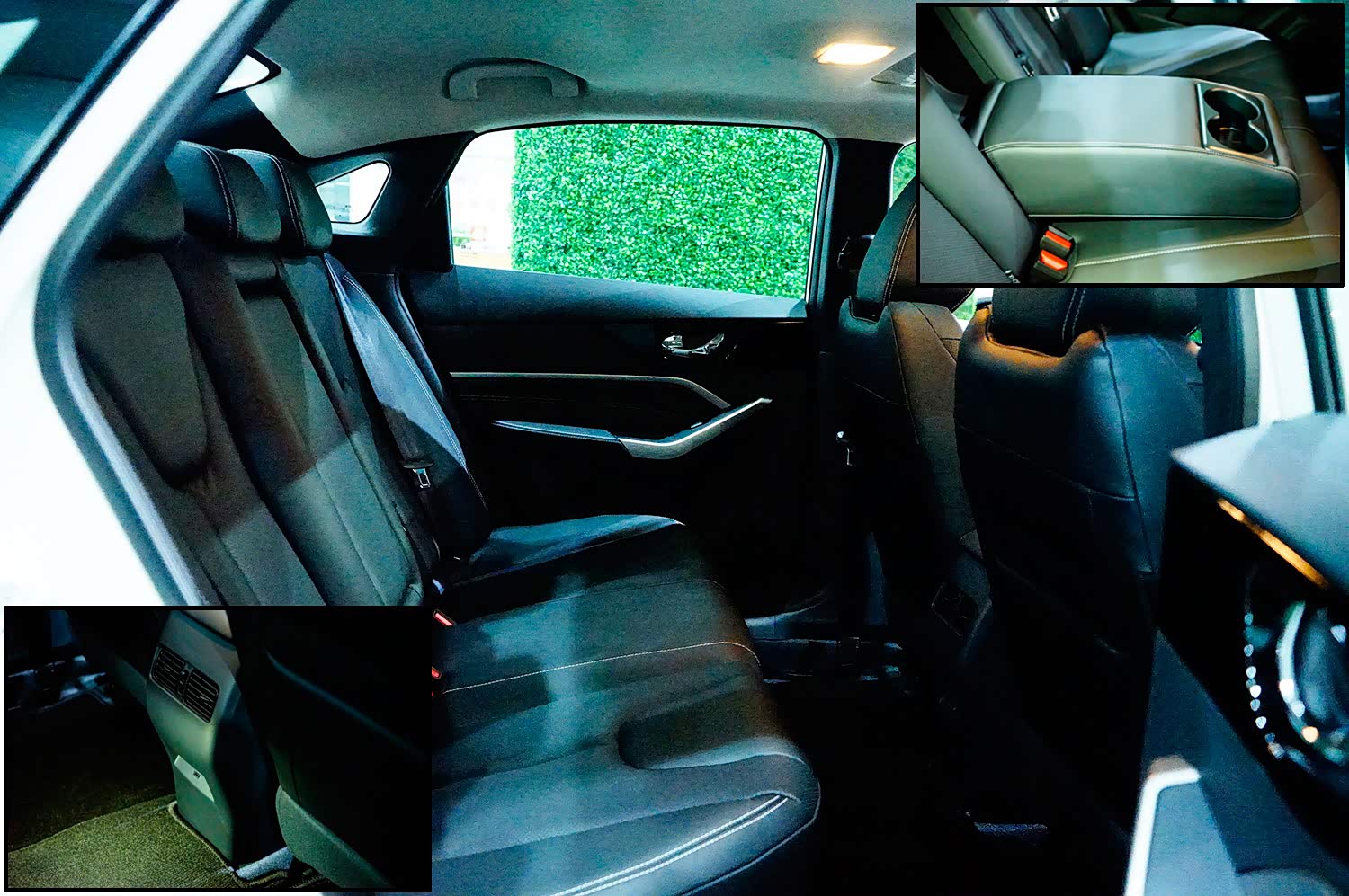 后排座椅材质与前排相同,坐垫和靠背足够宽大,在保证承托性的前提下填充物有较大的弹性,使座椅与身体的贴合度更高,保留了日产大沙发的感觉。空间方面,侃弟175cm,腿部空间两拳有余、头顶一拳两指、横向乘坐三个成年人也没问题。配备了三个独立伸缩头枕、带两个水杯架的翻折扶手、地台式空调出风口和一个USB接口。