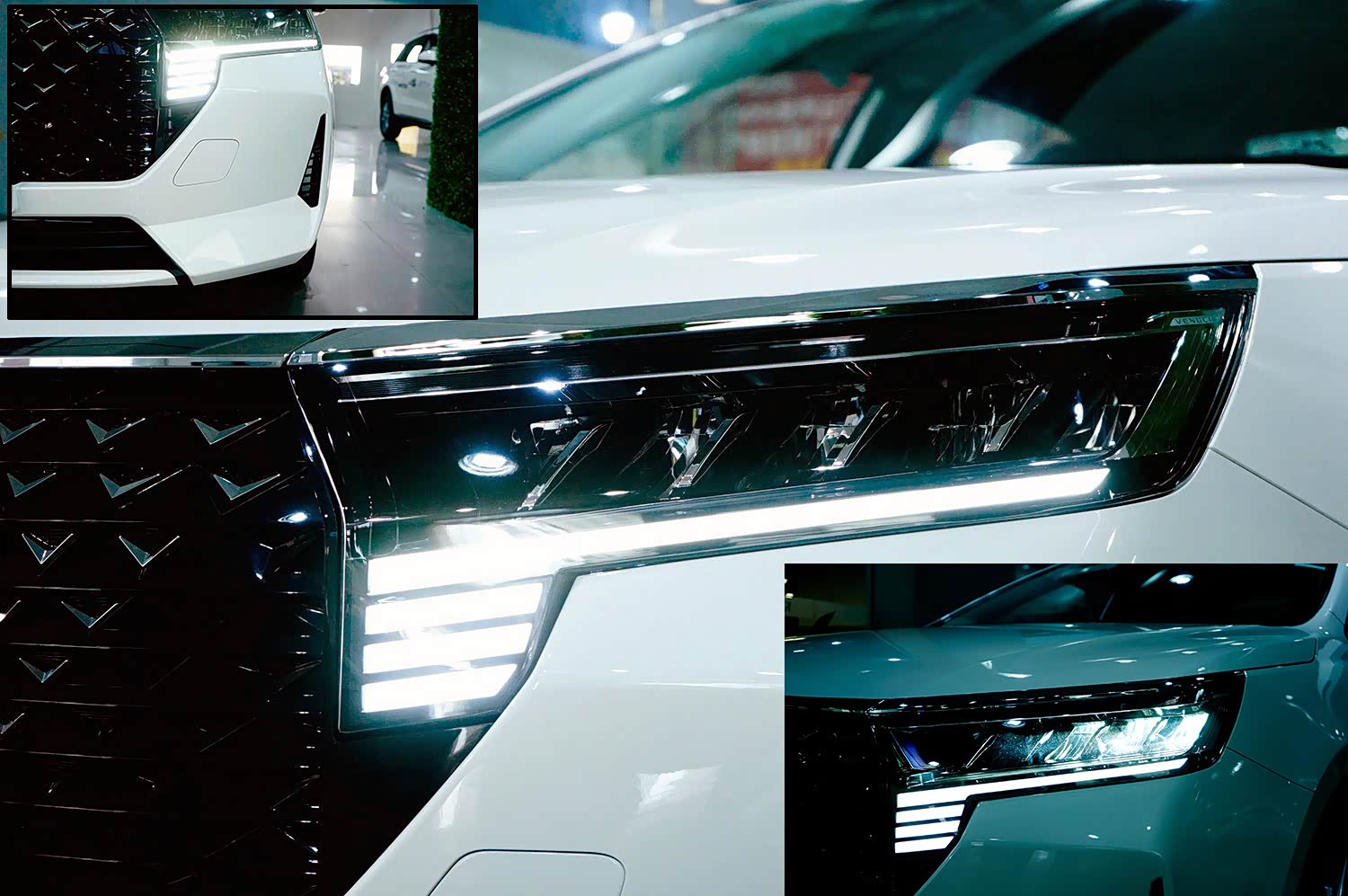 头灯与中网是整体式造型,顶部和侧边的融合度都很高。内部灯组采用5格水平排列,外侧3格为近光灯、内侧2格为远光灯。下方四辐式LED日行灯辨识度很高,上缘灯带修长,下方三行较短,基本上不会认错车。侧腮部分采用内收的导风槽结构,具备真实通风效果,有助于提升空气动力学性能。