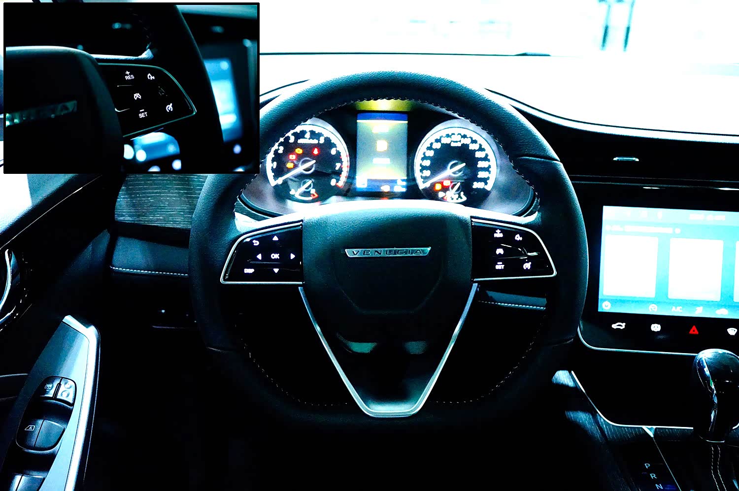 三辐式多功能方向盘采用真皮包裹(其余均为塑料材质),直径很合适但握感不算饱满,皮质的触感较为细腻,平底造型便于掌控角度。横辐上的多功能按键也采用平面化布局,并有背光显示功能,比较直观。右侧设有定速巡航控制模块(除入门车型均有配备),左侧主要是多媒体和行车电脑控制。