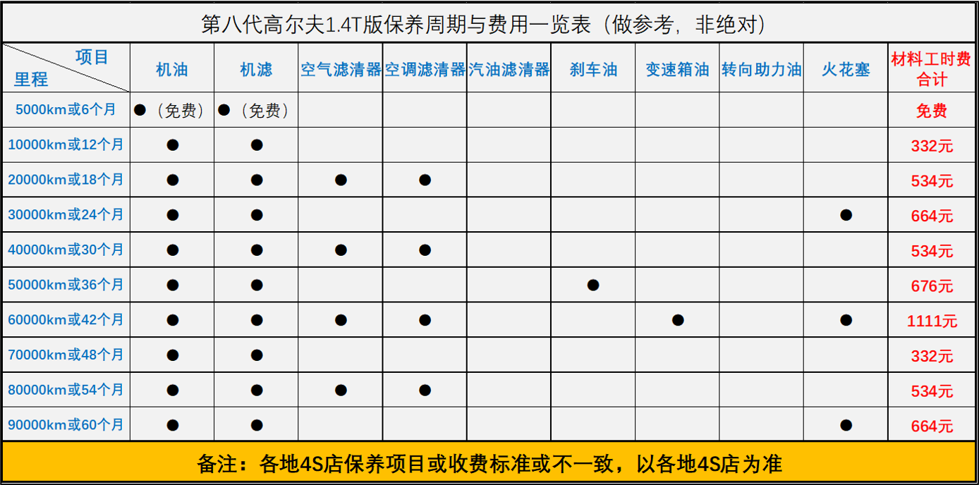 在保养的项目上来看,高尔夫他的首保是免费的,首保是发生在5千公里或6个月的时候,第二次的保养是1万公里或1年的时候,接下来的保养则是每1万公里或每半年保养一次。