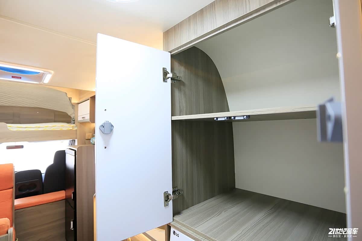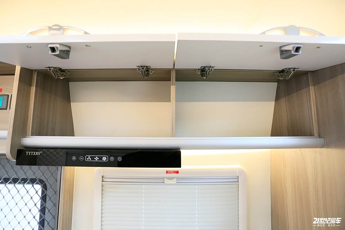 厨房顶部是两个储物吊柜,由于车体形状的原因,吊柜内呈梯形。